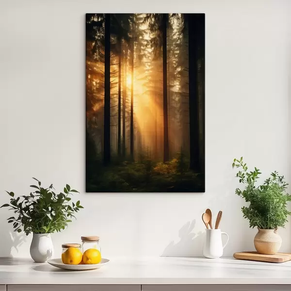 Paveikslas Tankus pušynas su saulėlydžio šviesa, realizmas, gamta Nr s44615