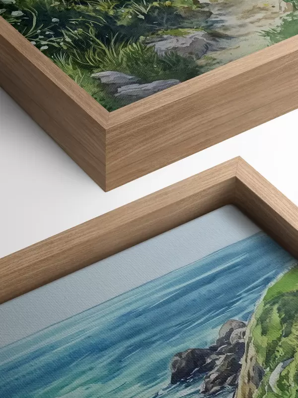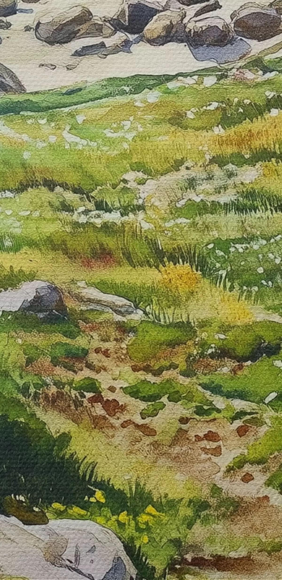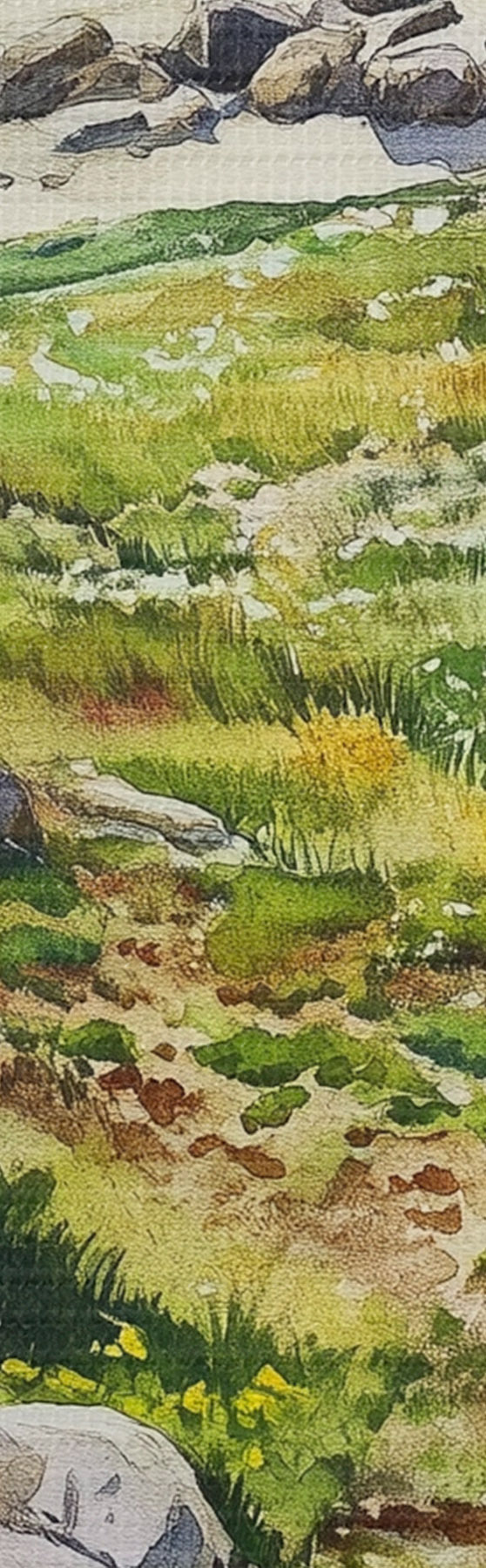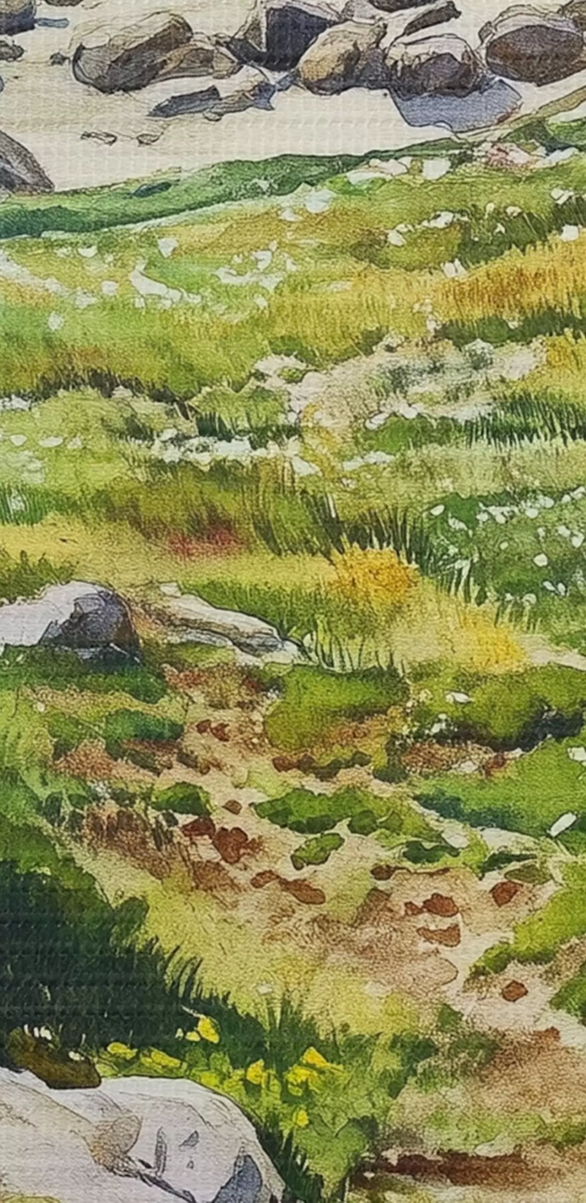 Paveikslas Jūros pakrantė su akmenimis ir žalia žole, akvarelės stilius, vasara Nr s44616