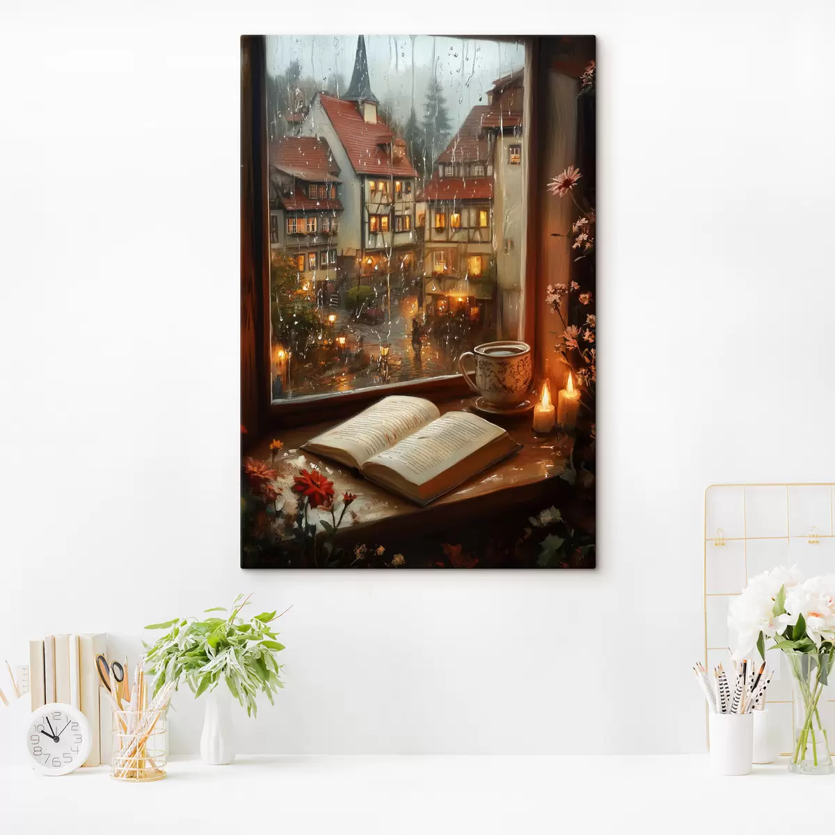 Paveikslas Knyga ant palangės, žvakės, lietinga diena, jauku Nr s44722