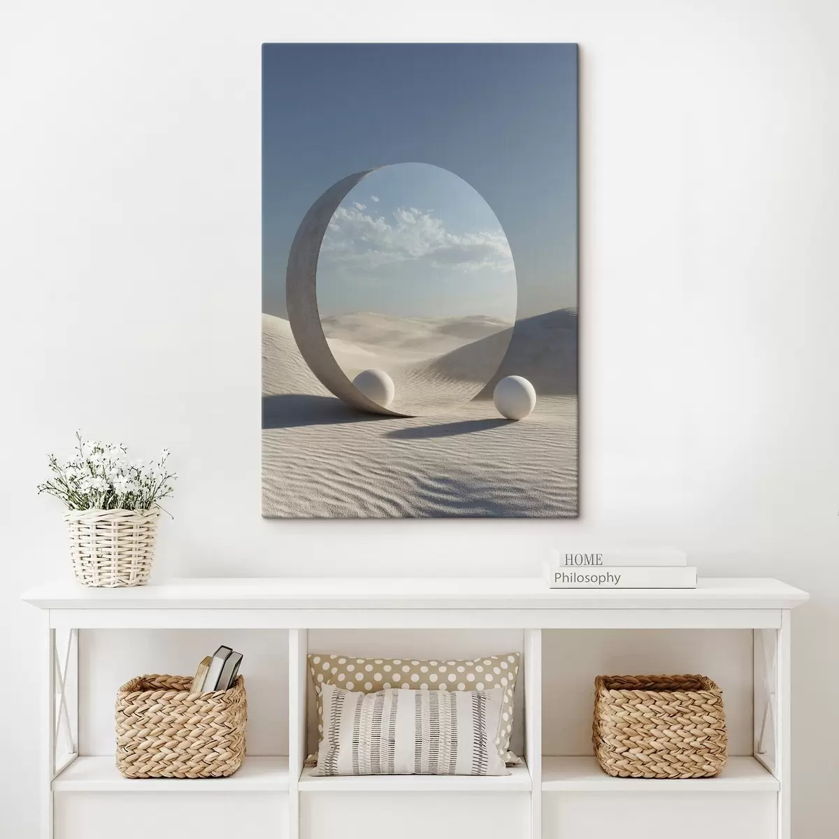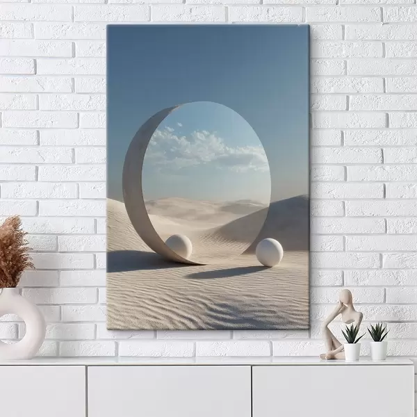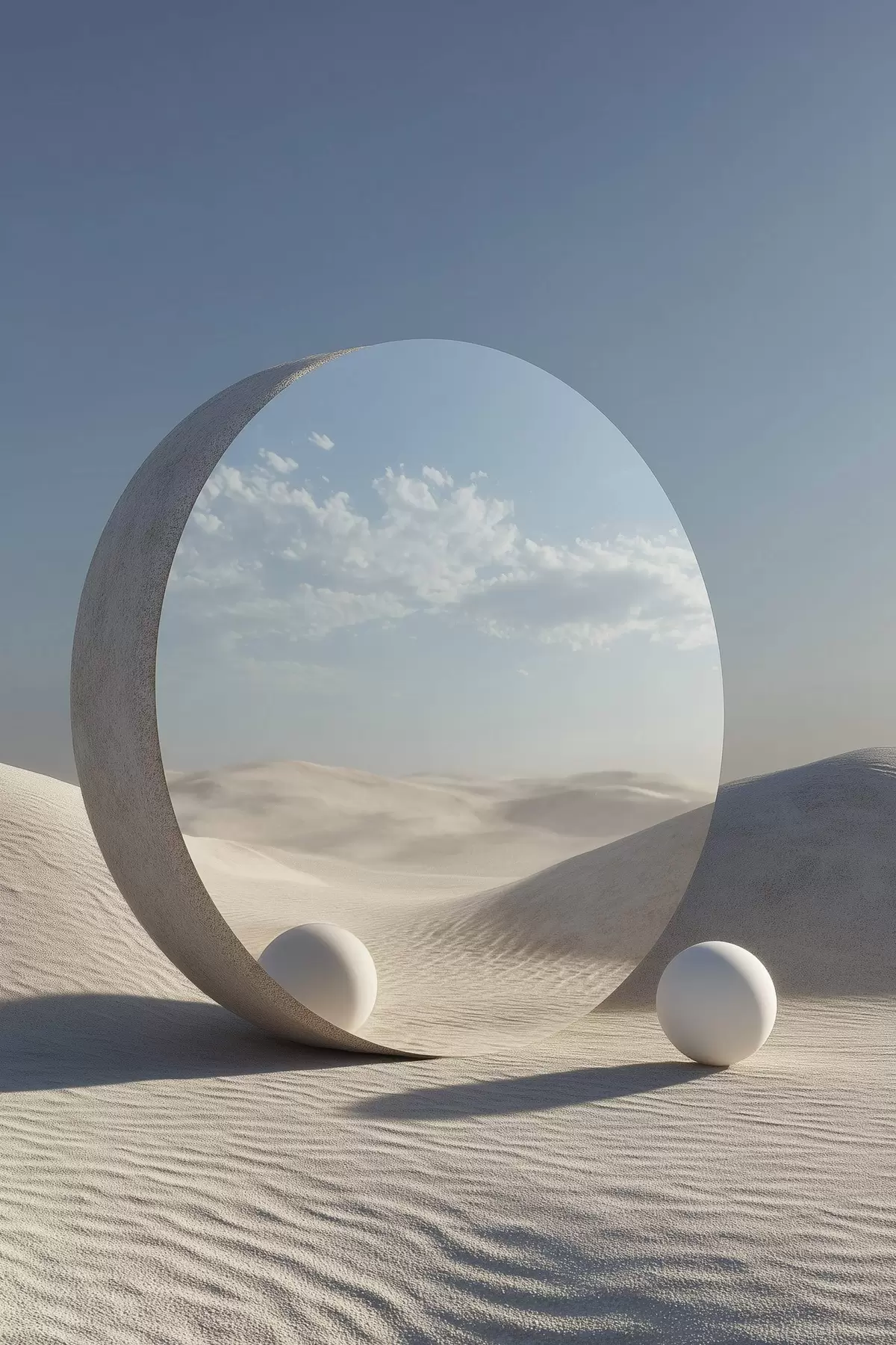Paveikslas Siurrealistinis dykumos kraštovaizdis su apvaliu veidrodžiu, kuriame atsispindi dangus ir mėnulis Nr s44792