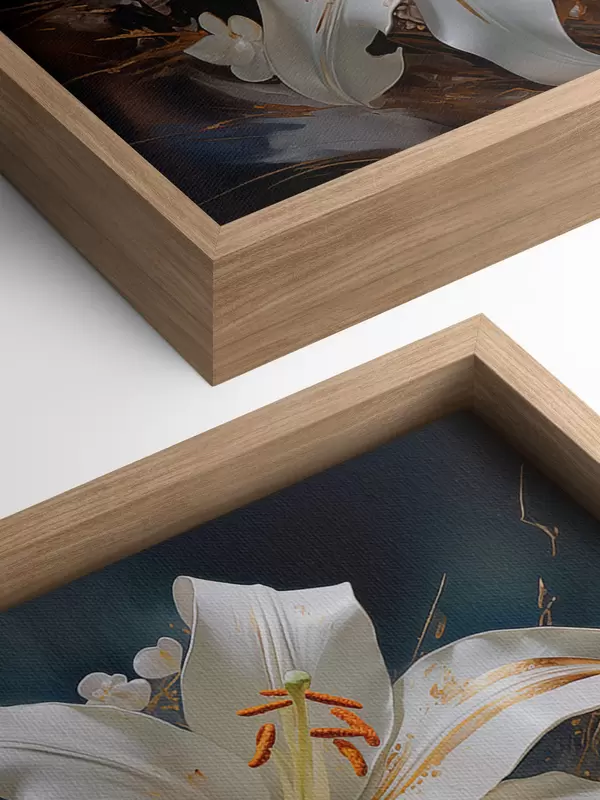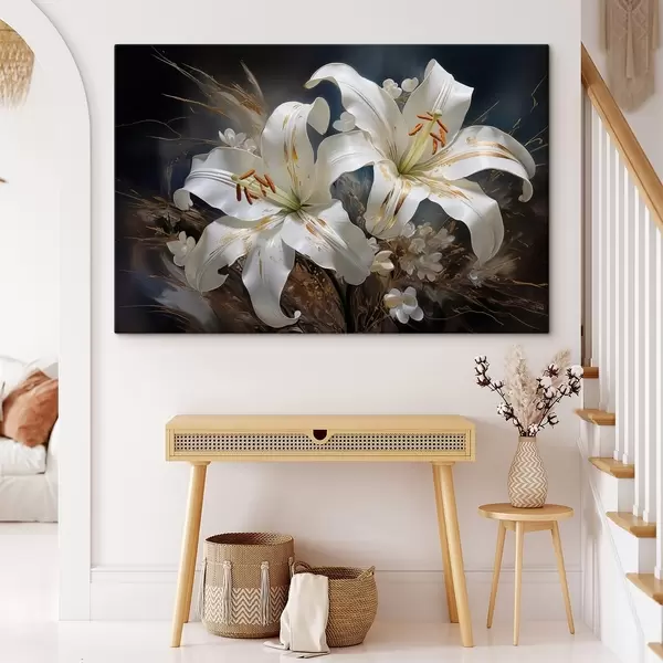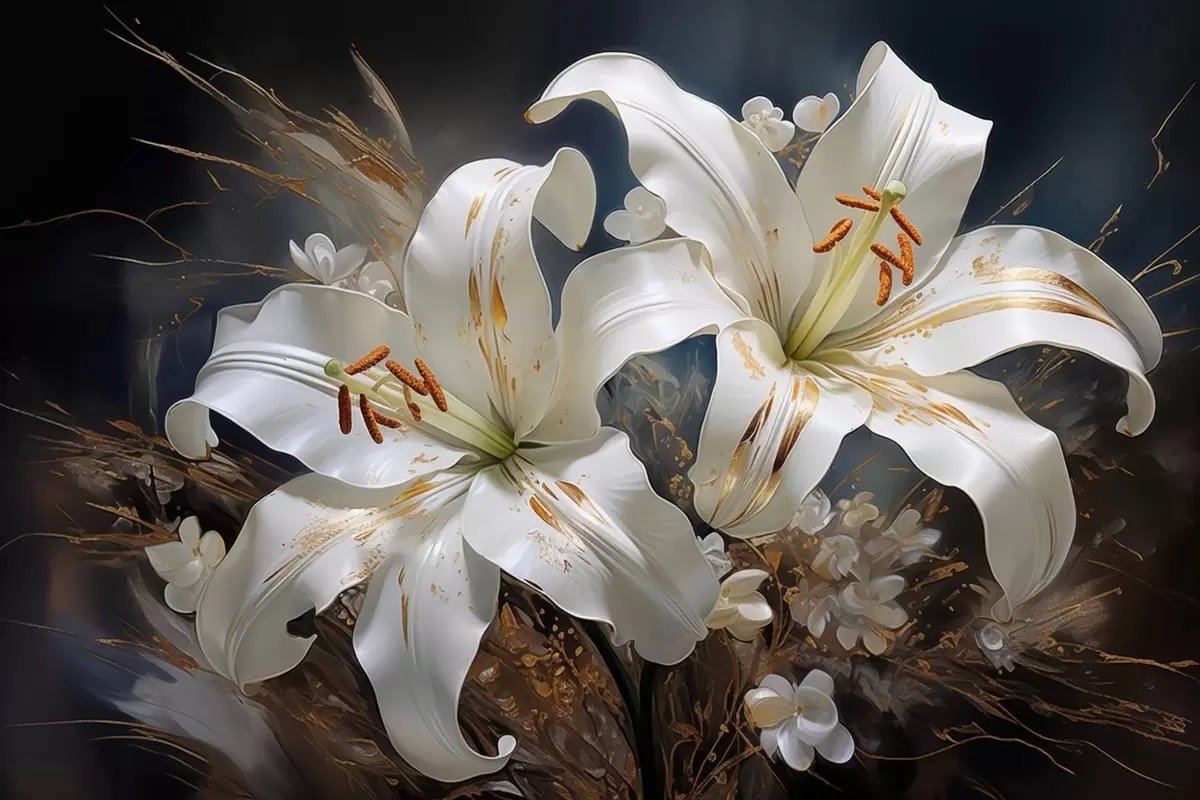 Paveikslas Lelijų gėlės tamsiame fone su dekoratyviniais elementais Nr s44848