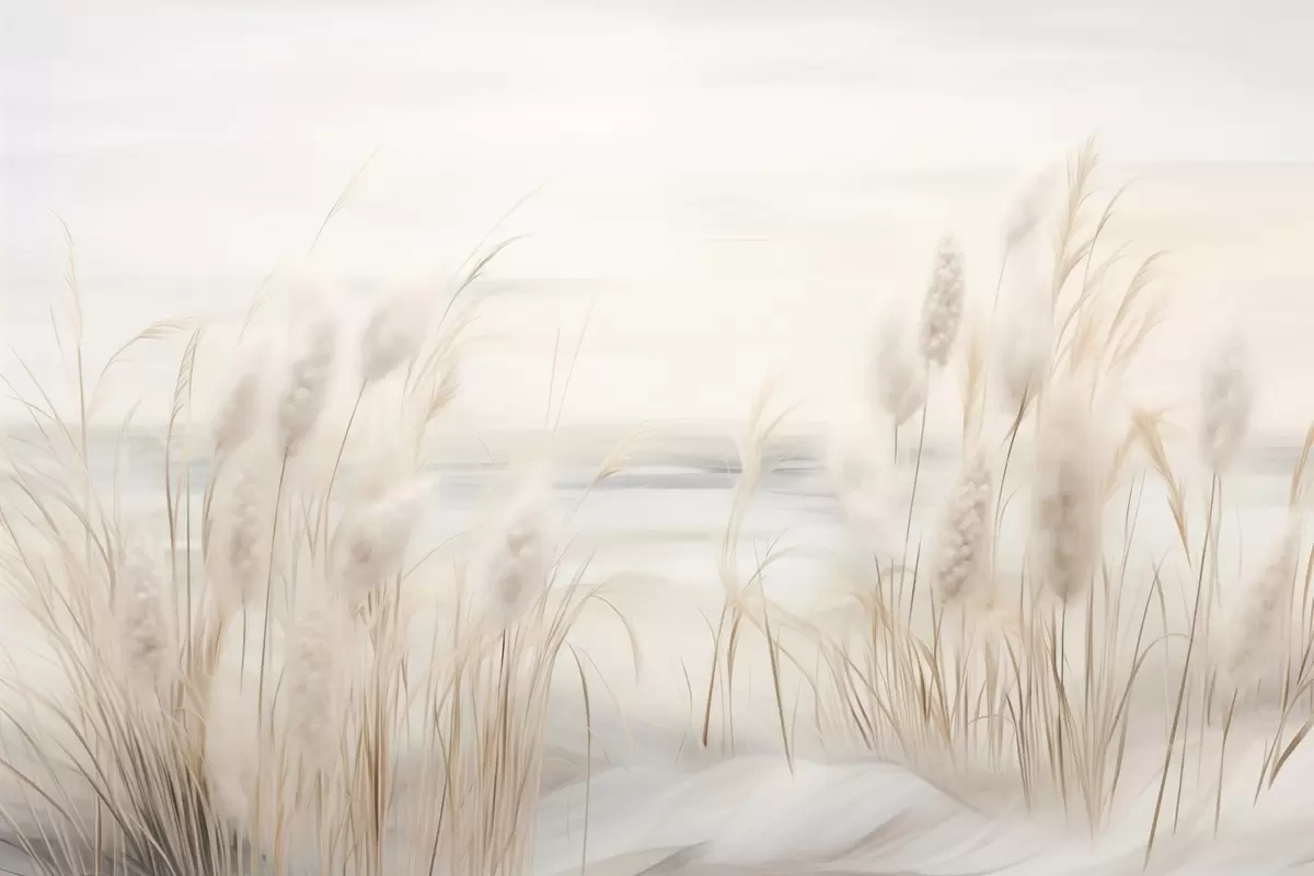 Paveikslas Smėlio spalvos nendrės pirmame plane, su sėklų galvutėmis, minkštos ir švelnios, neryškus fonas ir šviesus dangus Nr s44851