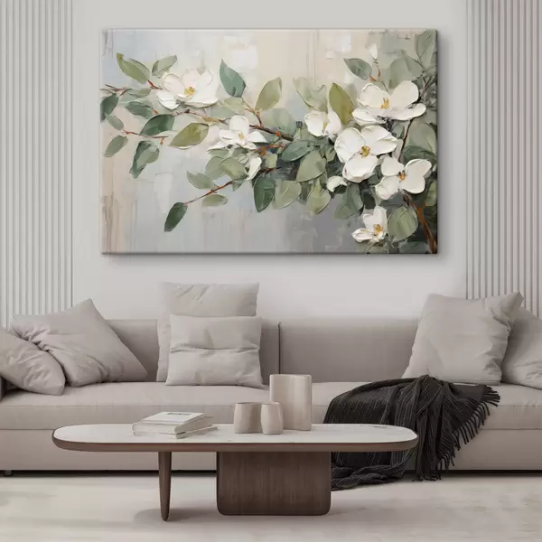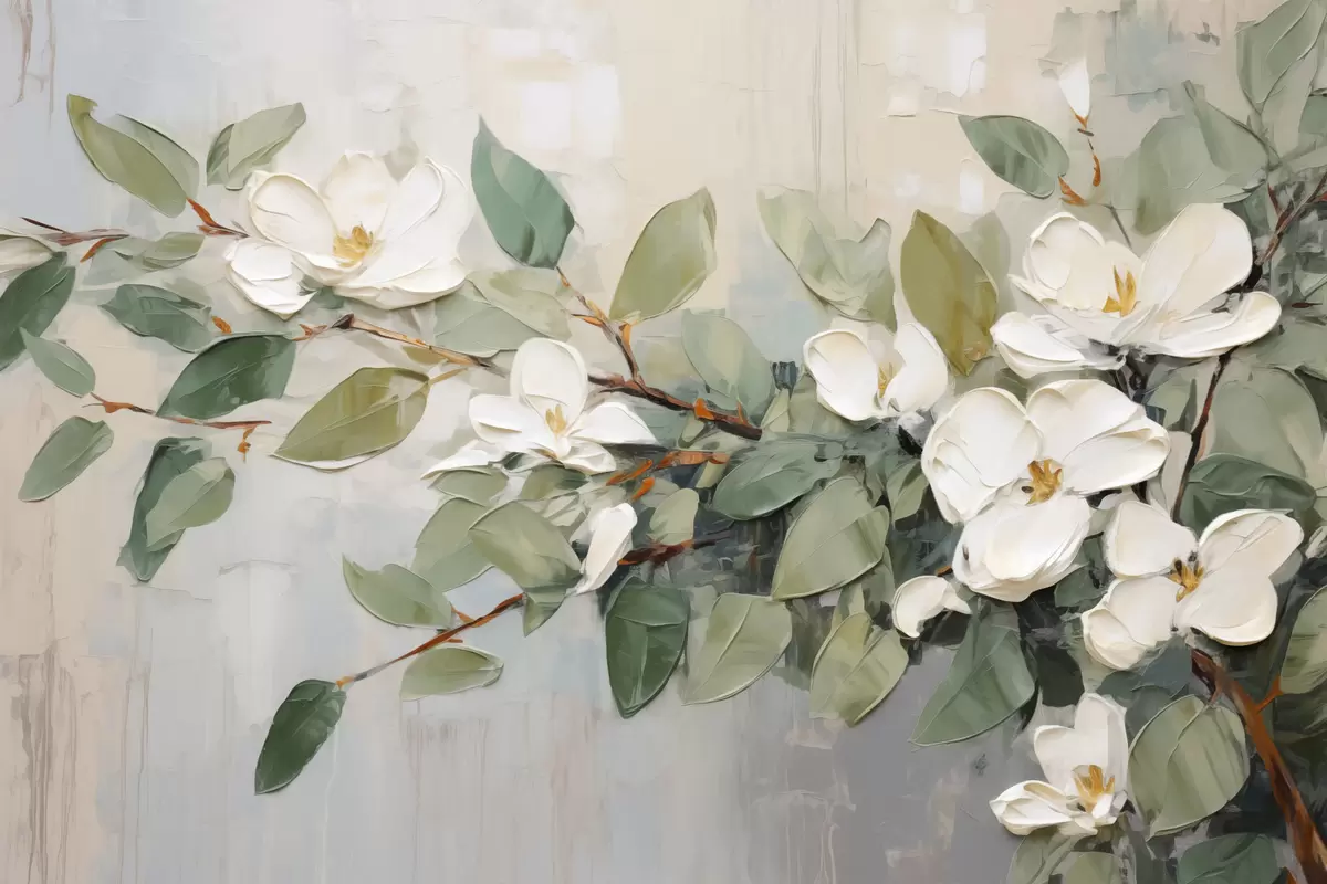 Paveikslas Magnolijos gėlės su žaliais lapais ant šakos, impasto tekstūros stilius, švelni spalvų paletė Nr s44853