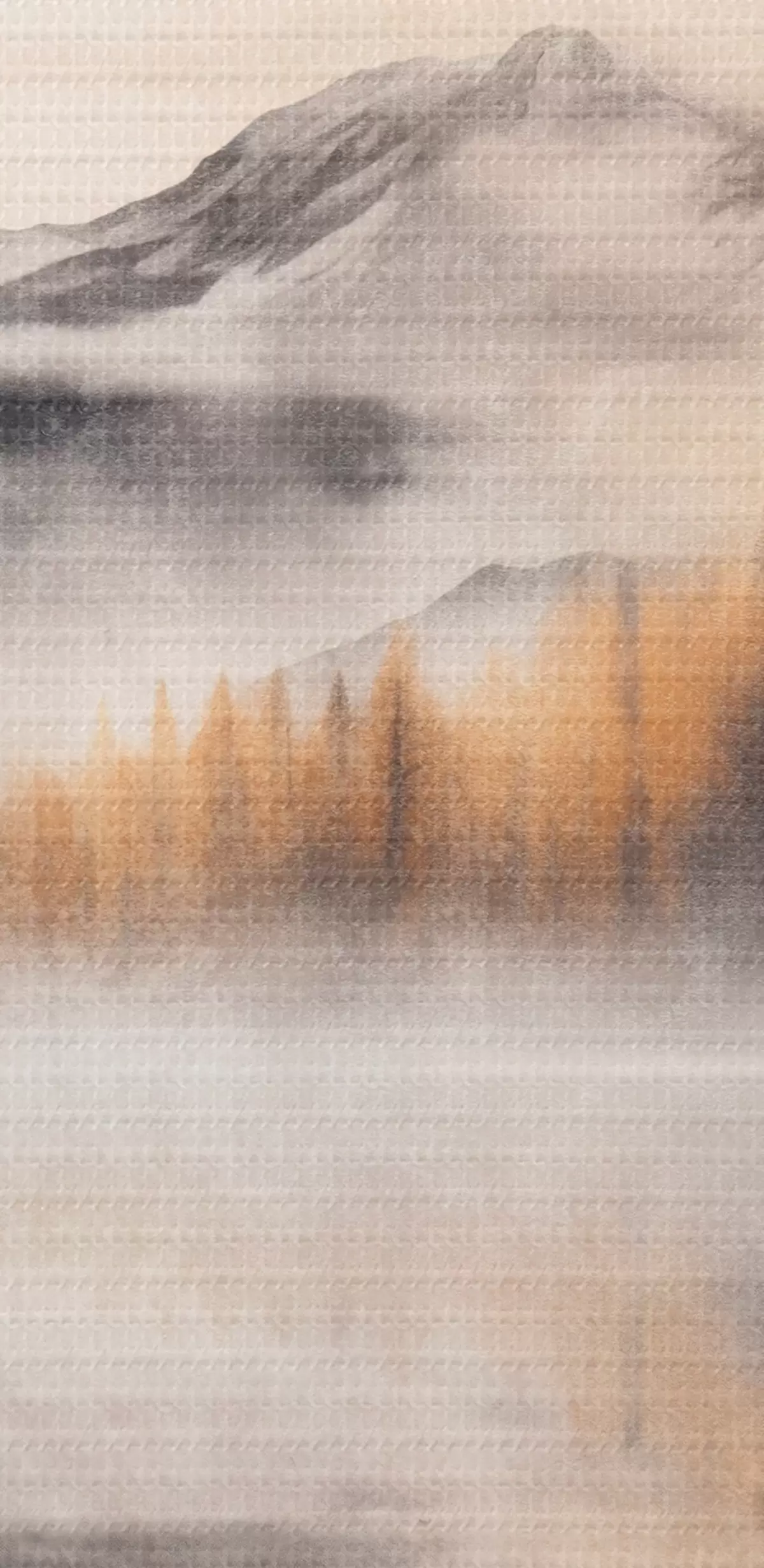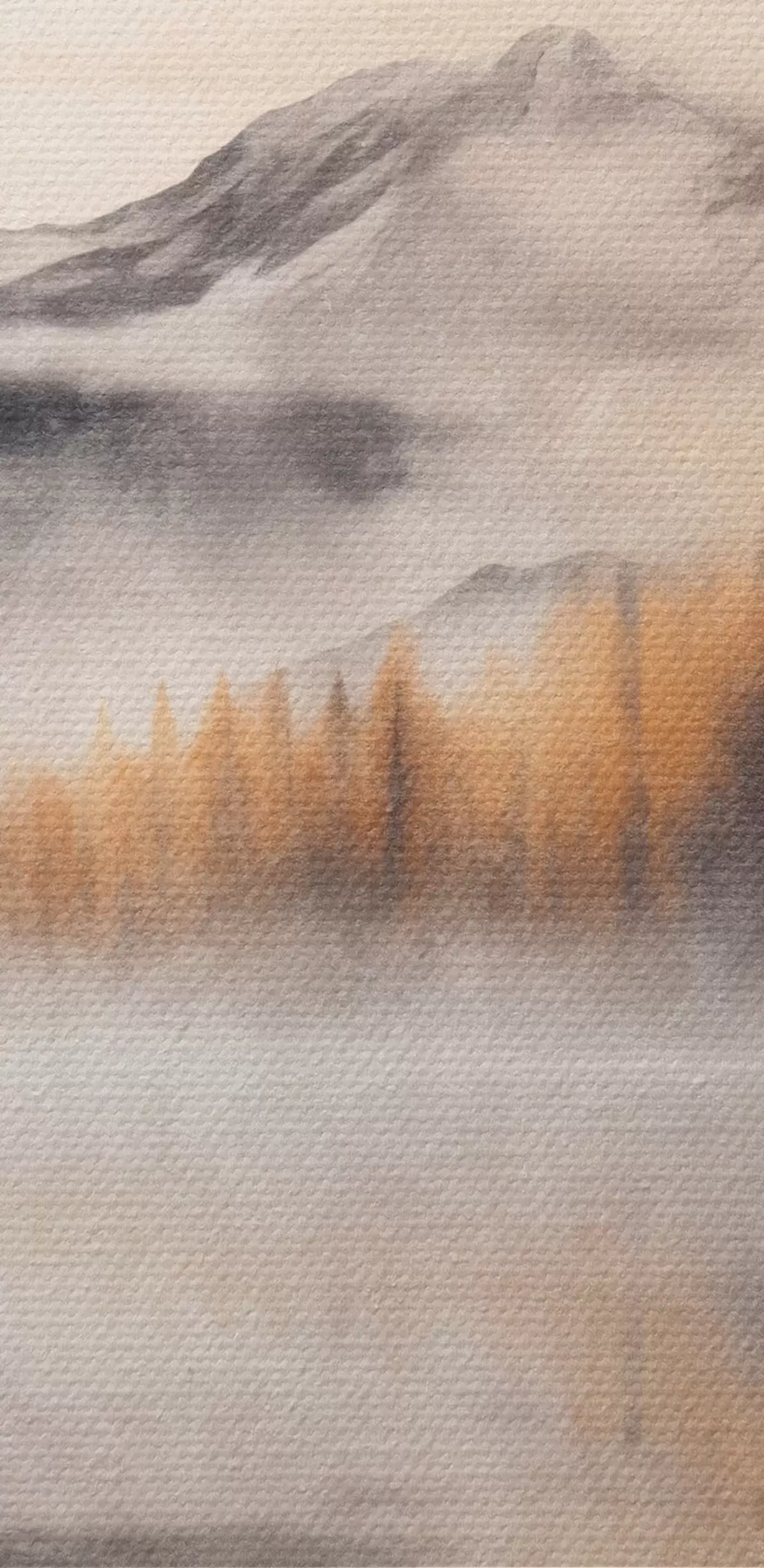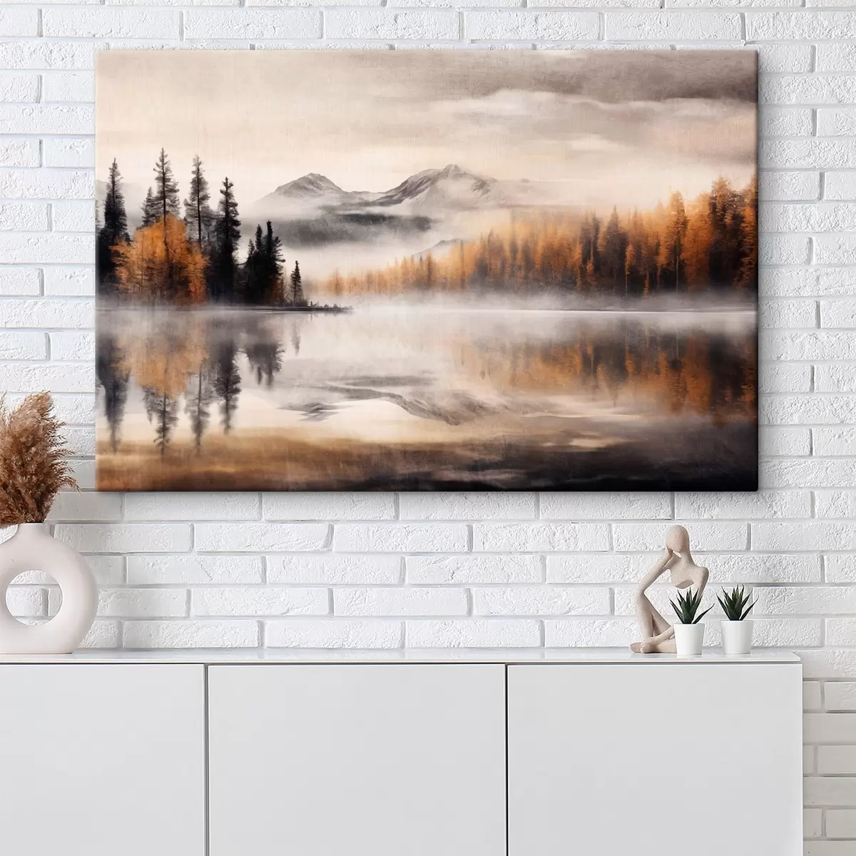Paveikslas Miglotas ežero kraštovaizdis su pušimis ir kalnais, debesuotas pilkas dangus Nr s44856