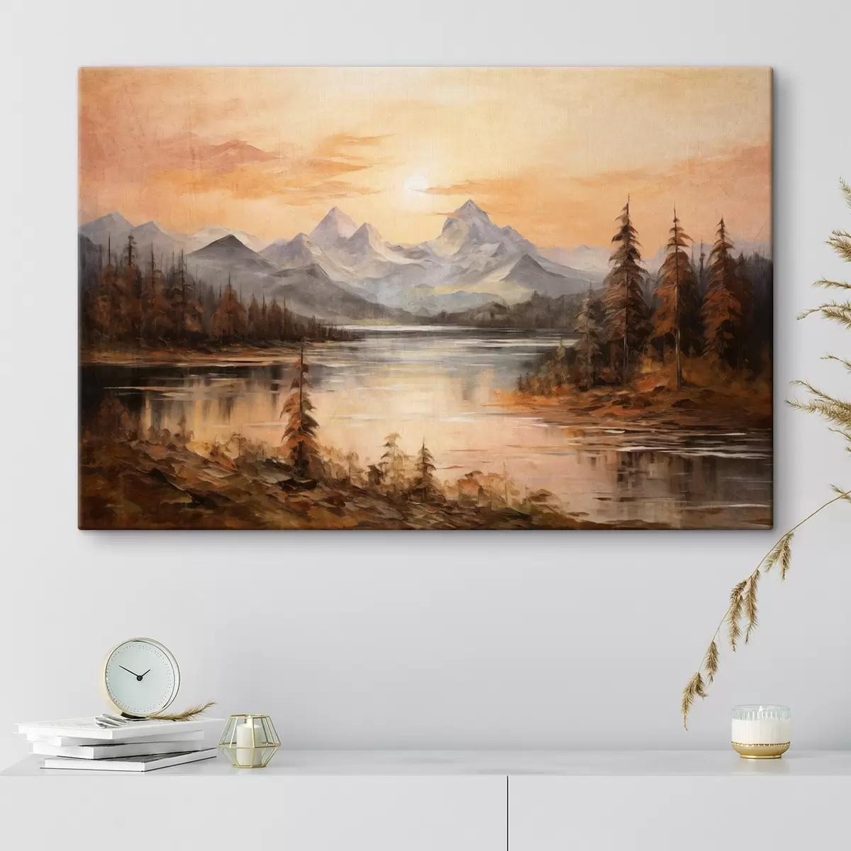 Paveikslas Kraštovaizdis su ežeru, apsuptu medžių ir kalnų fone, oranžinis dangus su saule Nr s44857