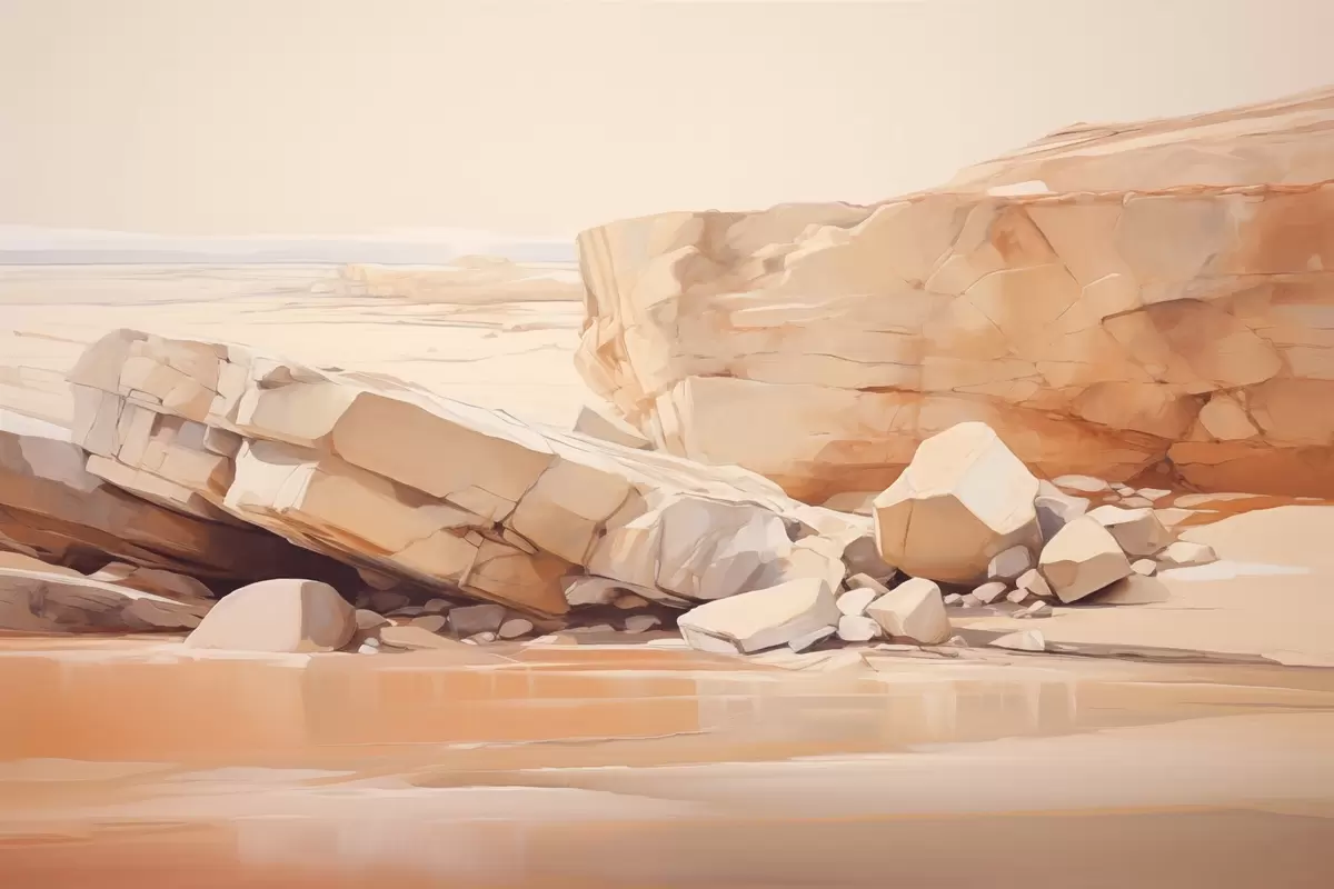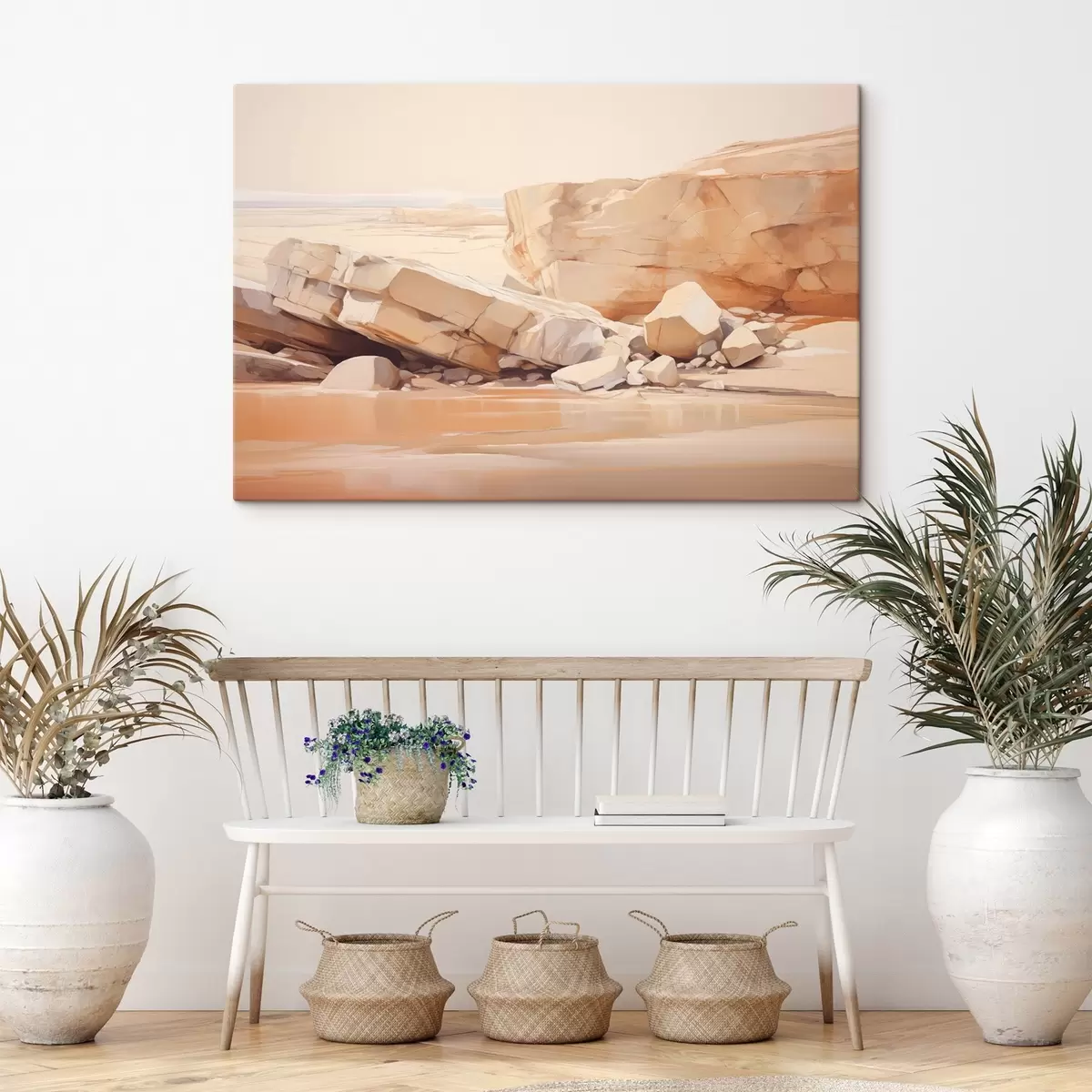 Paveikslas Minimalistinis uolėtas paplūdimio kraštovaizdis su dideliais šviesiai rudais rieduliais ir skaidriu vandeniu Nr s44865