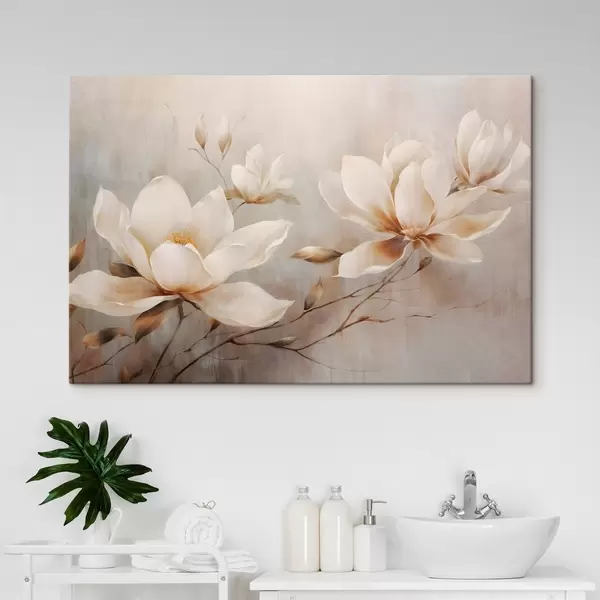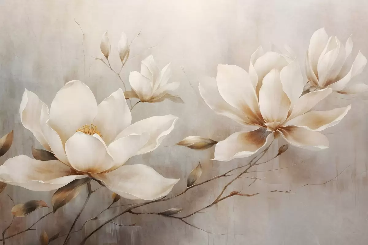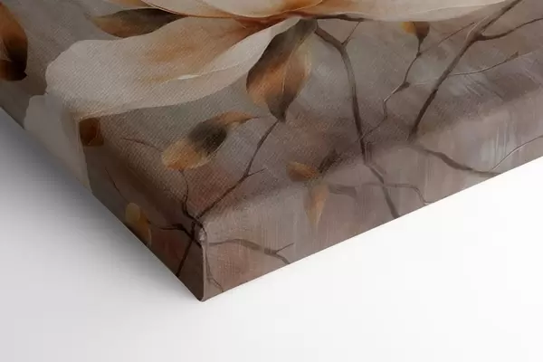 Paveikslas Tekstūruotos senovinės baltos magnolijos gėlės ant šakų šviesiai rudame fone Nr s44869
