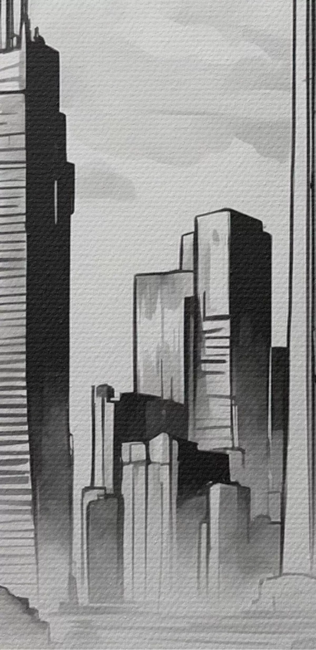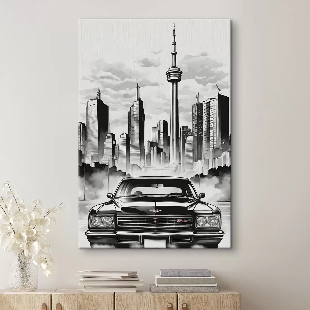 Paveikslas Retro automobilis nespalvoto miesto su dangoraižiais fone Nr s44871