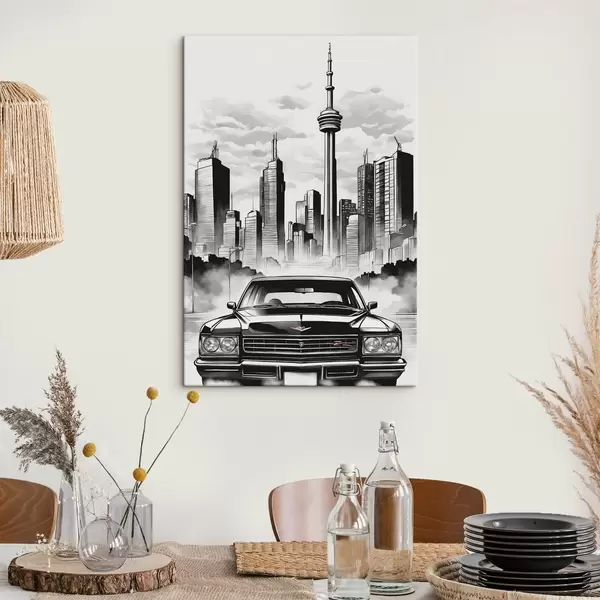Paveikslas Retro automobilis nespalvoto miesto su dangoraižiais fone Nr s44871
