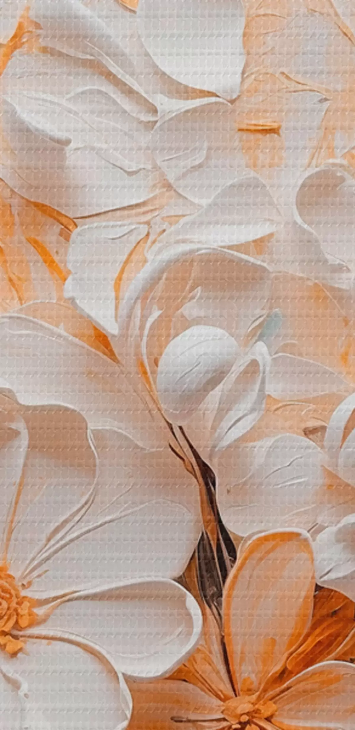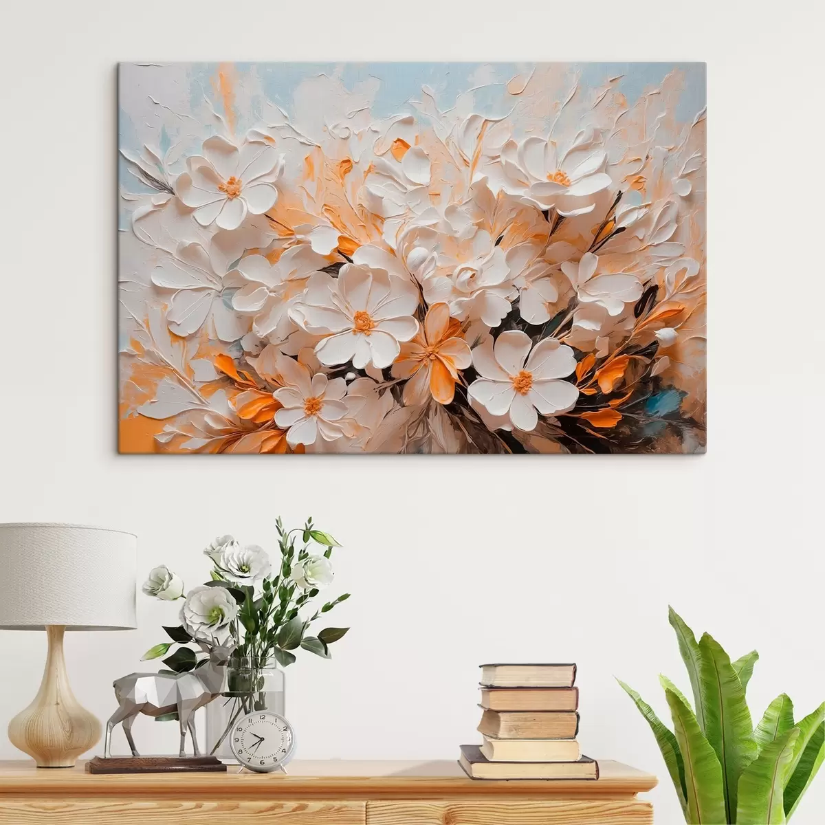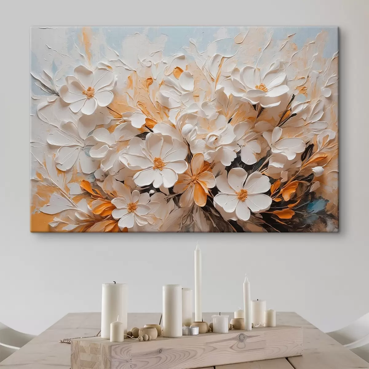 Paveikslas Baltos ir persikinės gėlės mėlyname fone su pastelinėmis spalvomis Nr s44879
