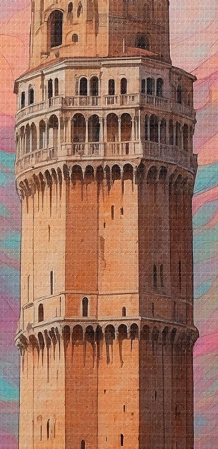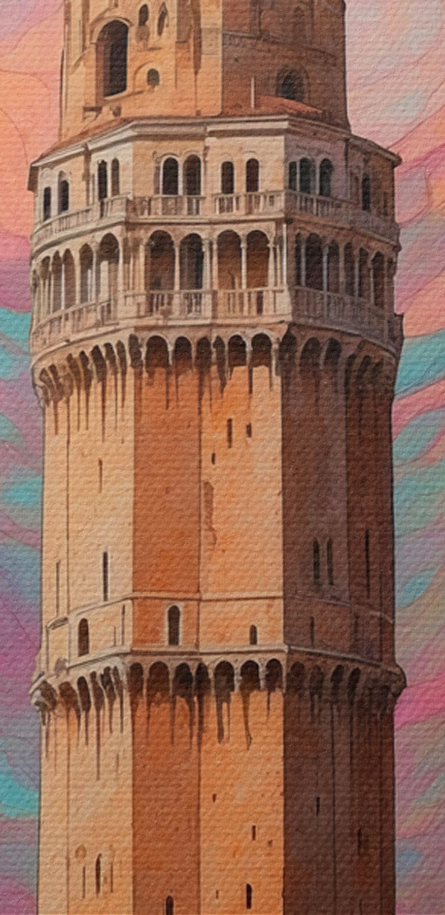 Paveikslas Fantazijos bokštas su rausvomis ir mėlynomis spiralėmis dangaus fone Nr s44885