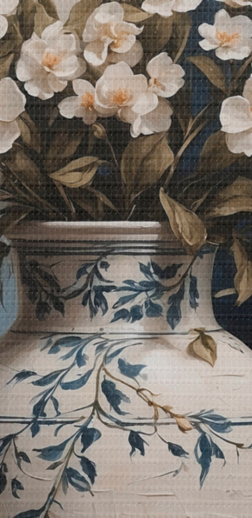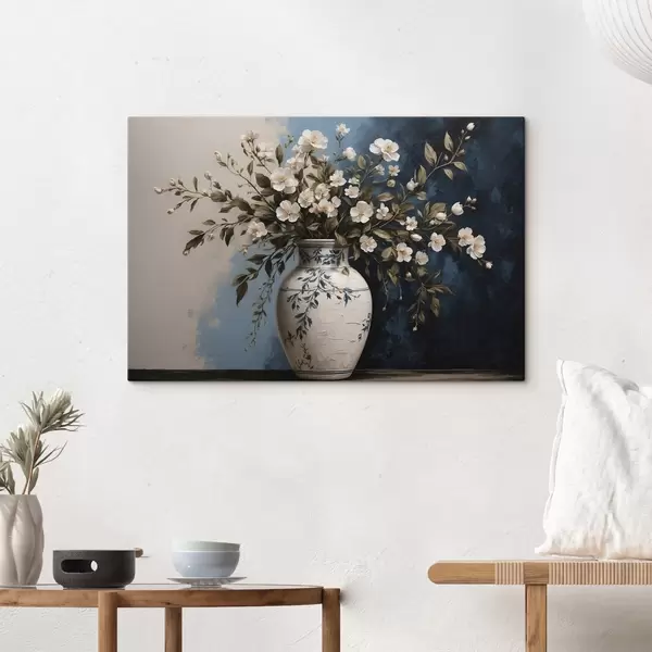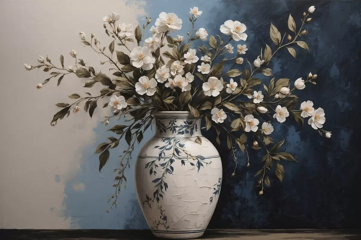 Paveikslas Baltos ir geltonos gėlės didelėje vazoje mėlyname fone Nr s44893