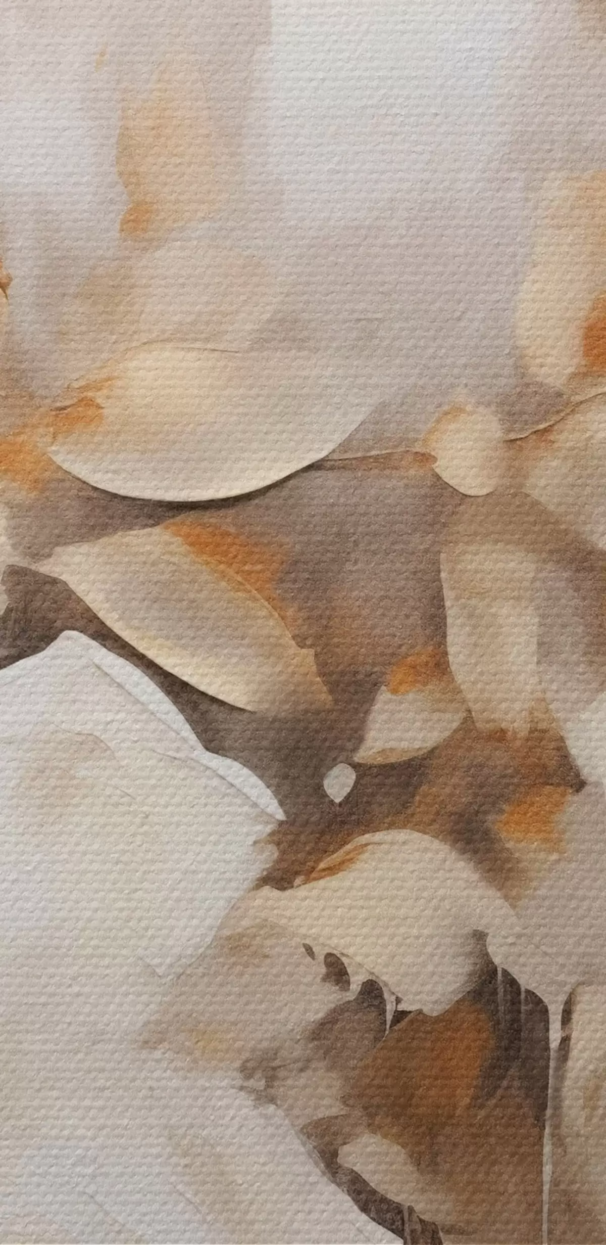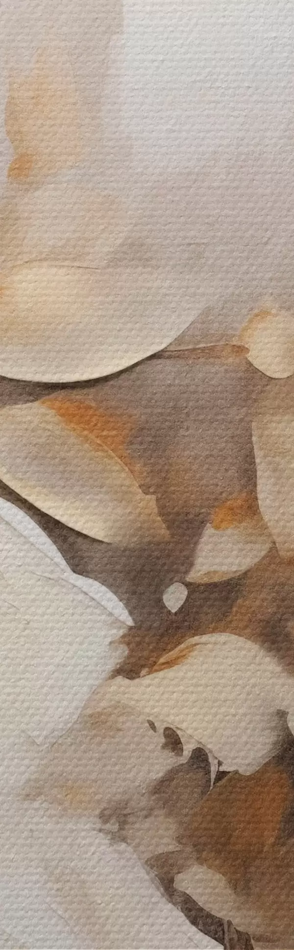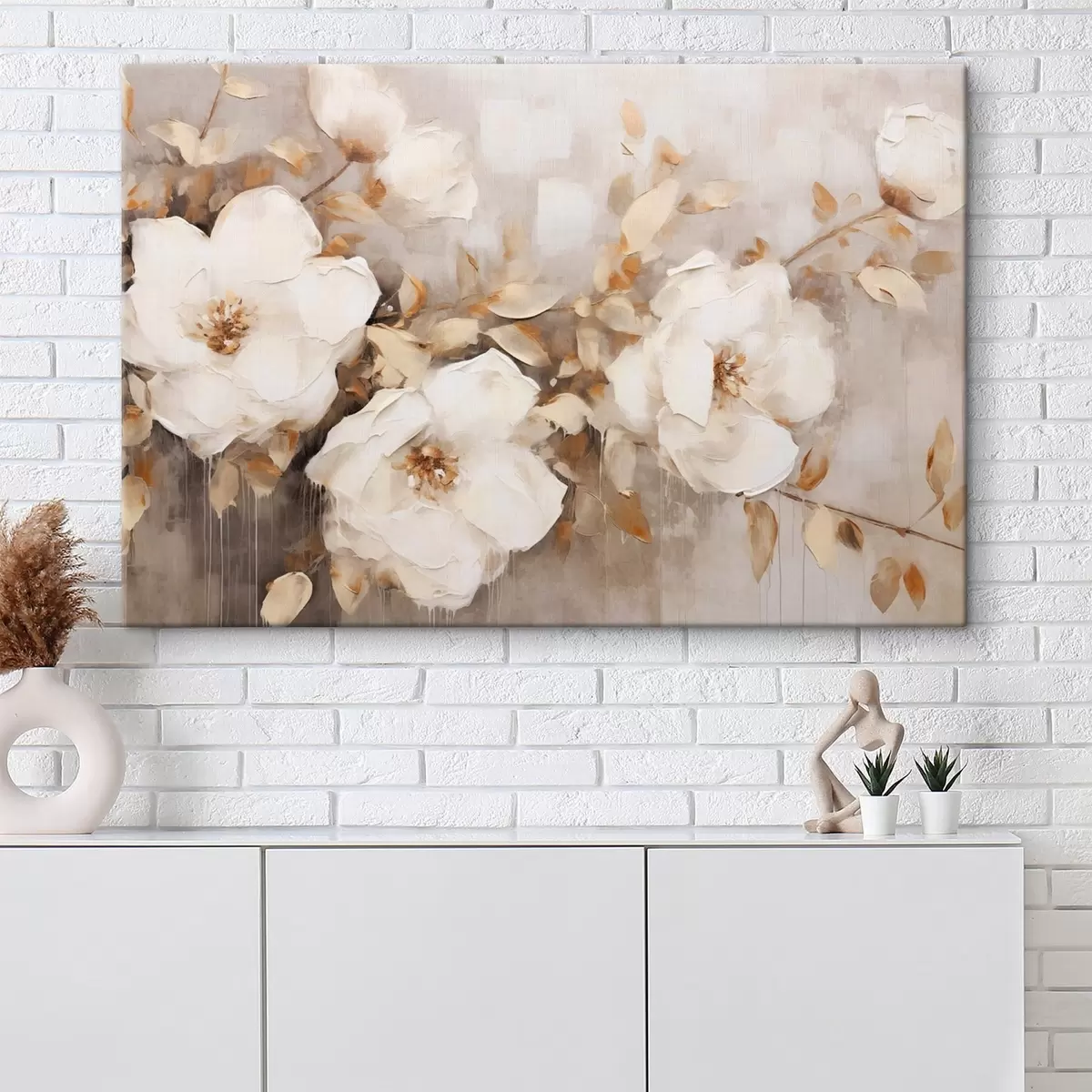Paveikslas Baltos gėlės su rudais lapais smėlio spalvos fone, aliejinės tapybos imitacija, gėlių kompozicija, botanikos menas Nr s44922