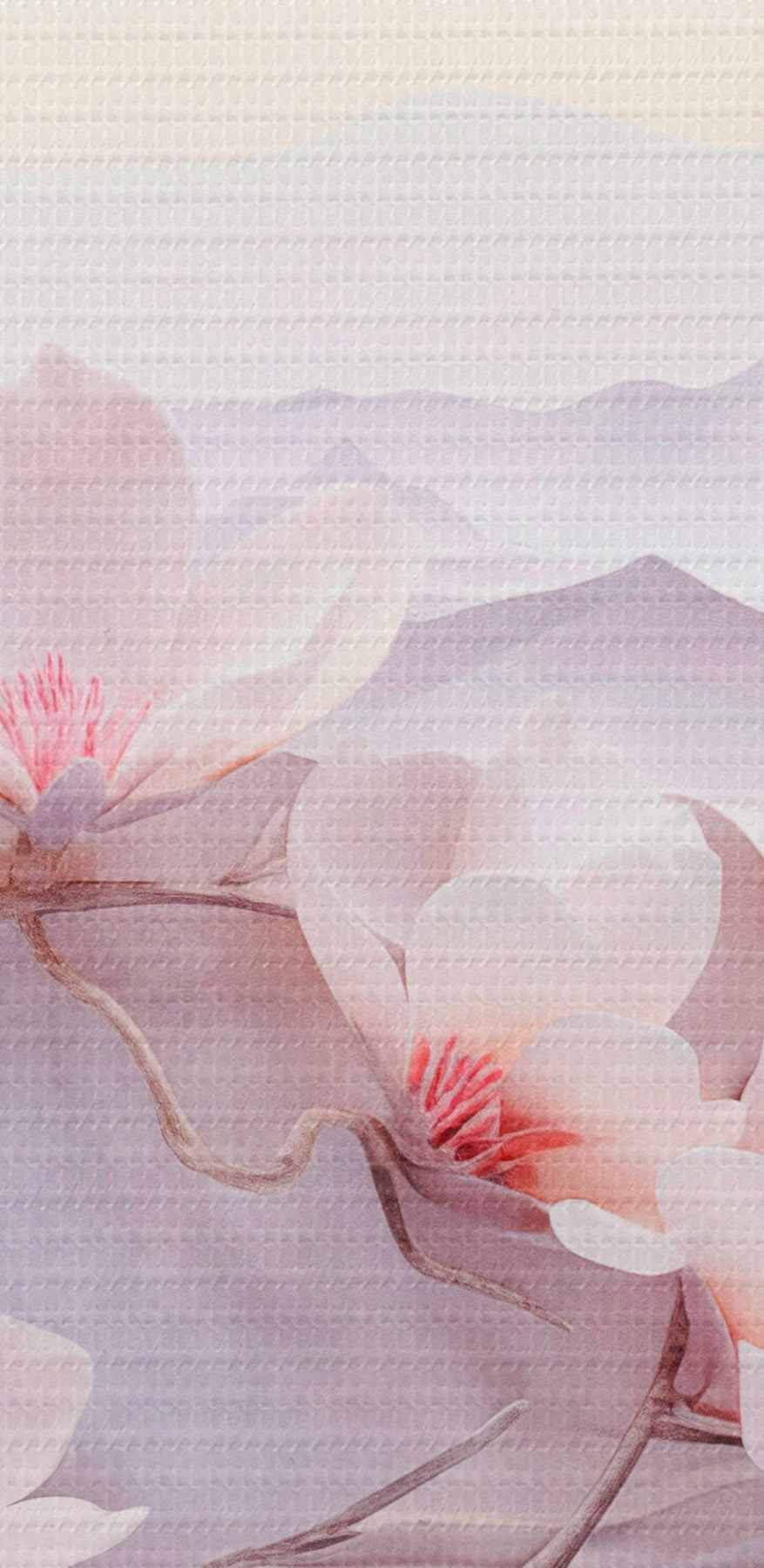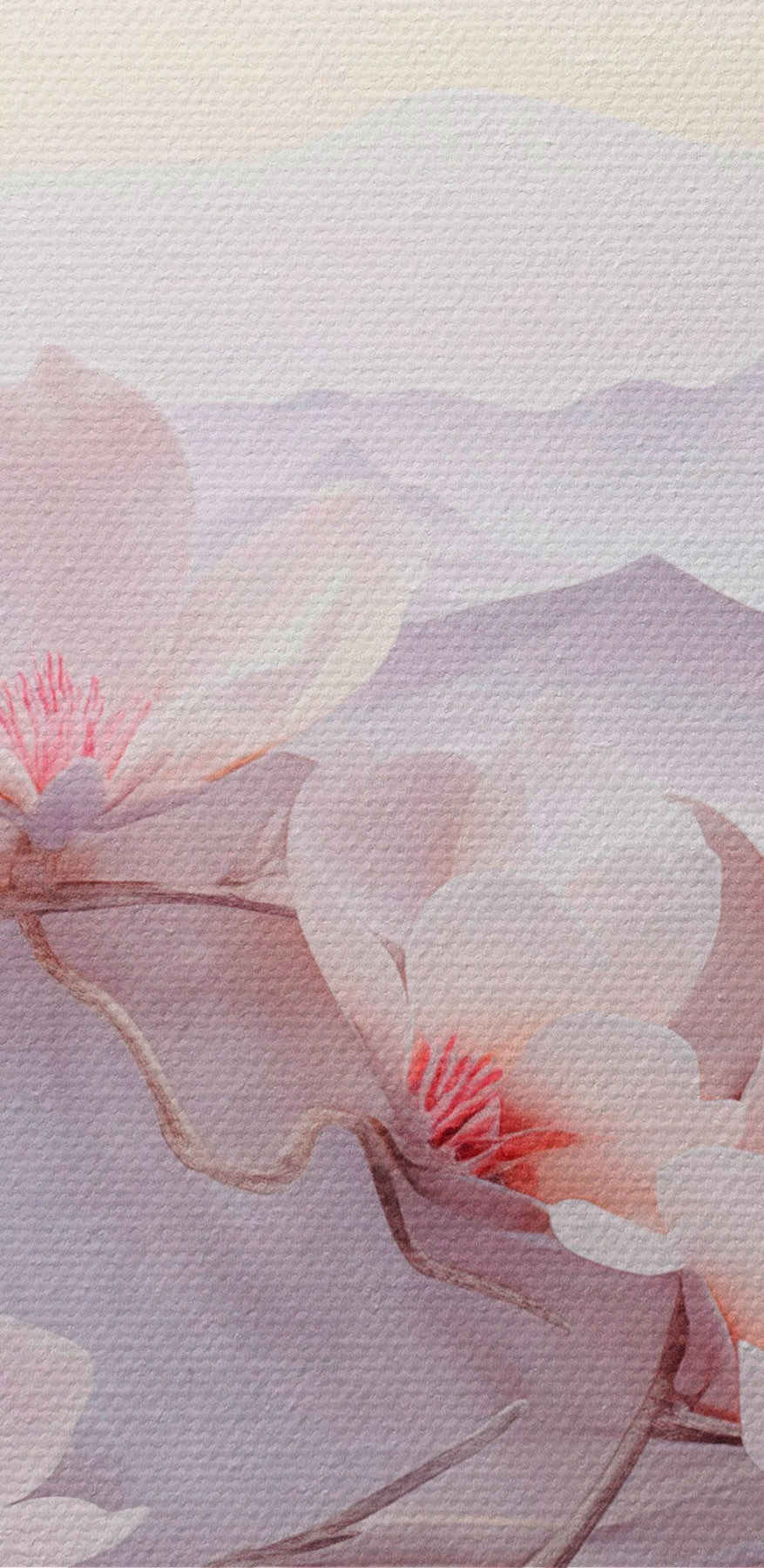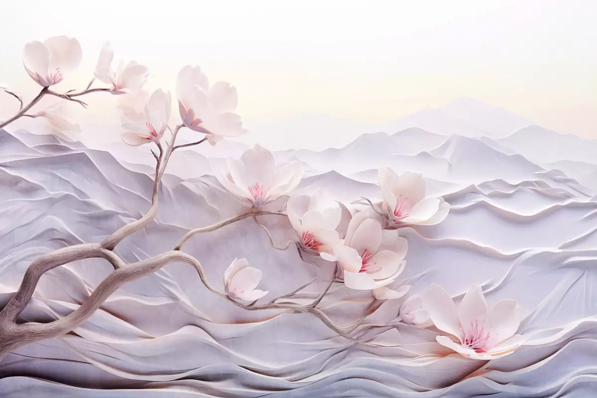 Paveikslas Žiedų šaka su rausvais žiedais, kalnai fone, švelnios pastelinės spalvos, japonų tekstūrinis menas Nr s44930