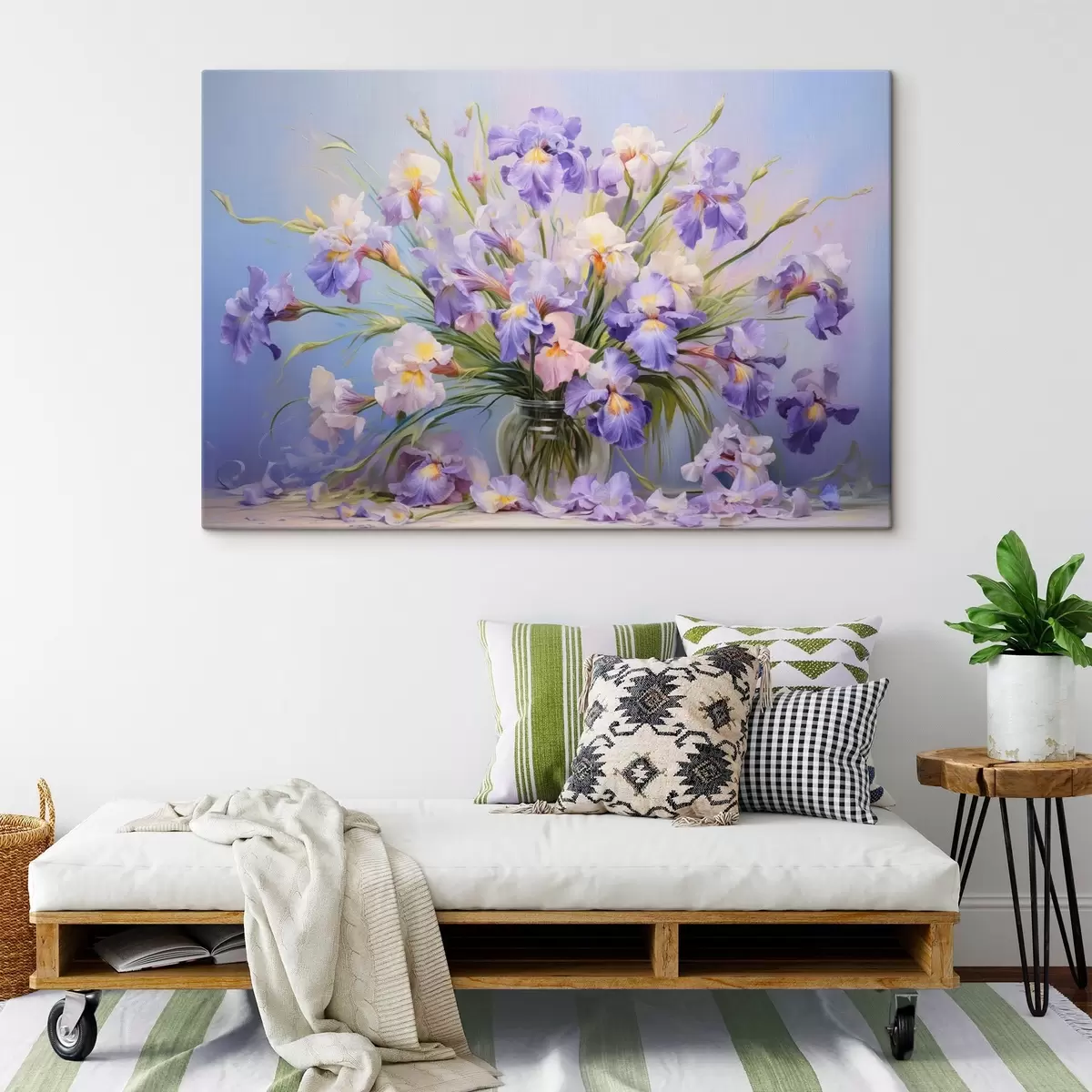 Paveikslas Vaza su daugybe pastelinių irisų, keli žiedlapiai išbarstyti ant stalo, švelnus pastelinis mėlynos ir rožinės spalvos fonas Nr s44933