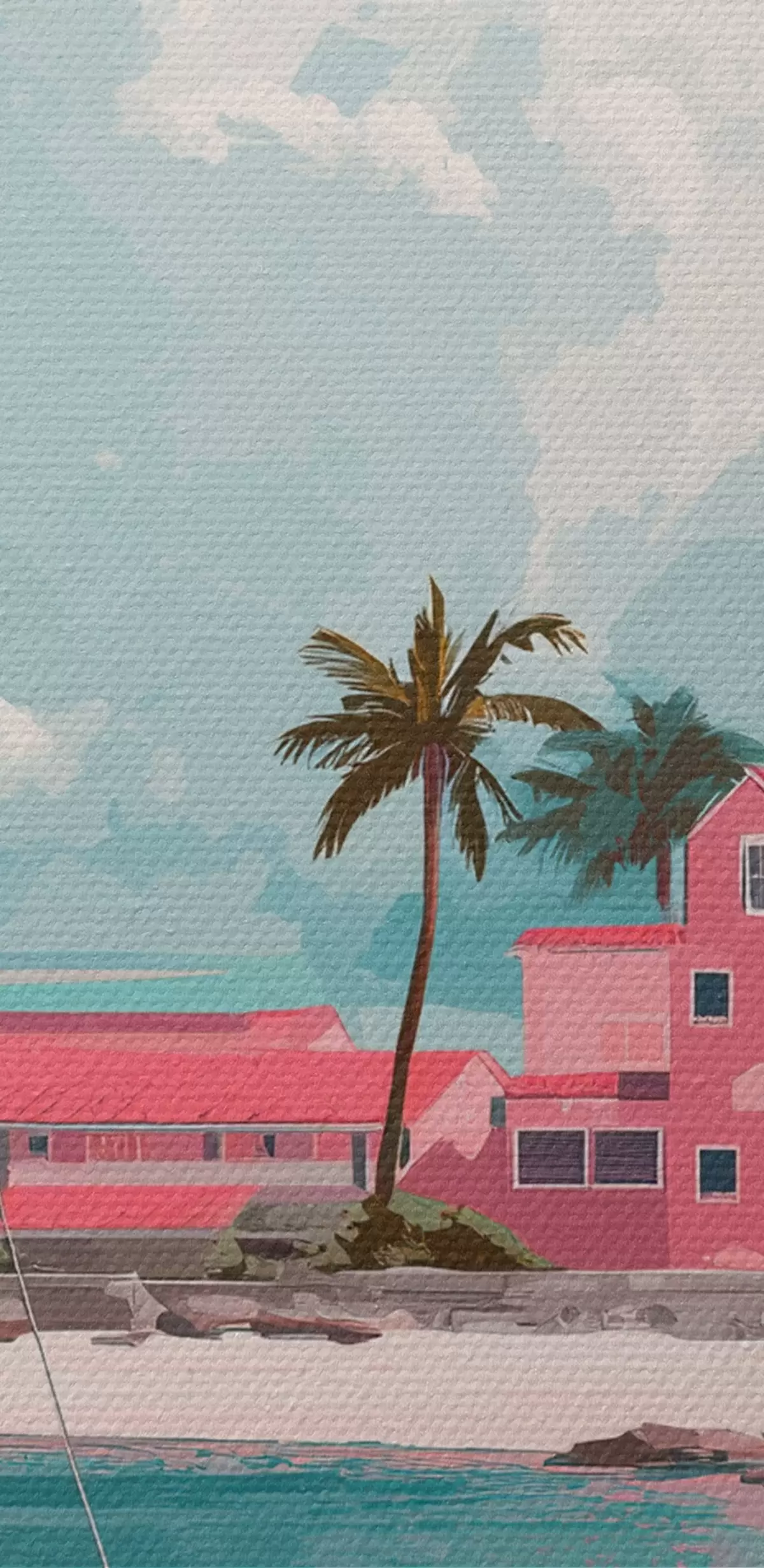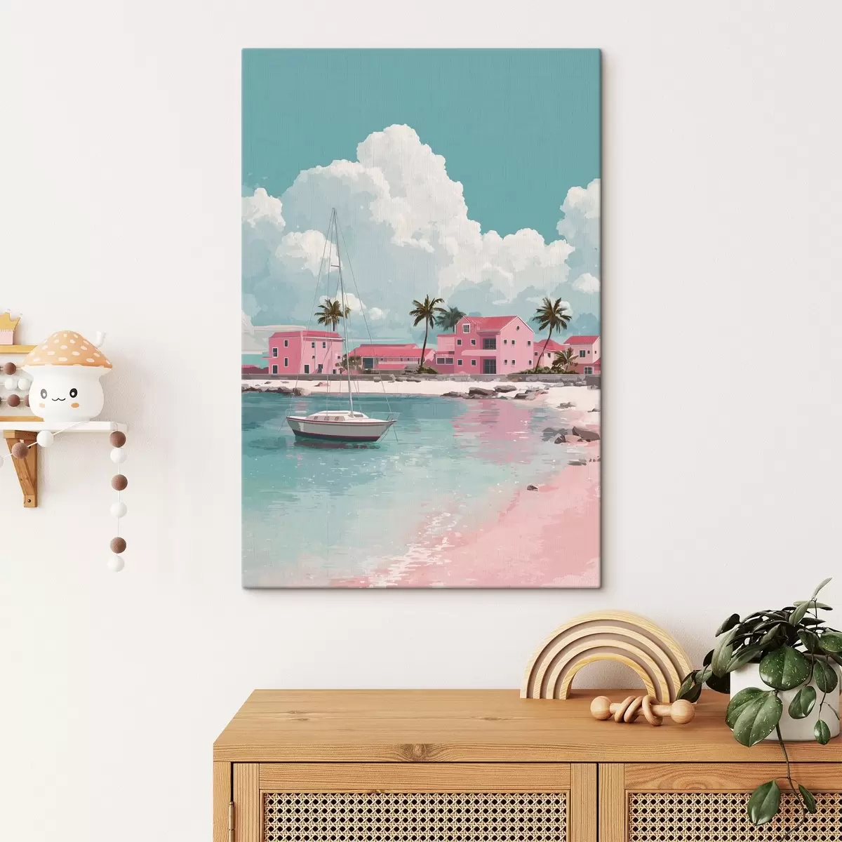 Paveikslas Rožinis paplūdimys su ryškia saule, burlaiviu ir namais Nr s44986