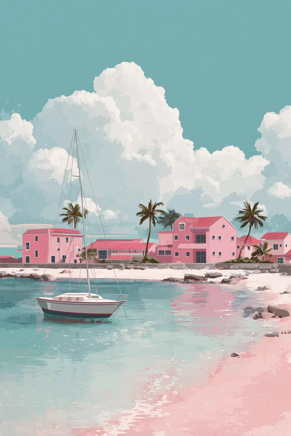 Paveikslas Rožinis paplūdimys su ryškia saule, burlaiviu ir namais Nr s44986