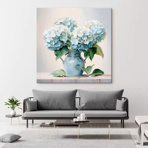 Paveikslas Šviežios hortenzijos mėlynoje vazoje šviesiame fone Nr s45043