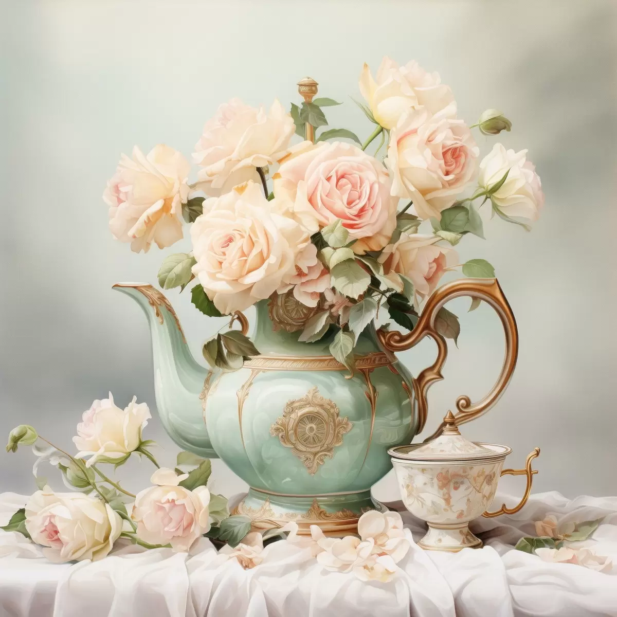 Paveikslas Natiurmortas su subtiliomis rožėmis arbatos rinkinyje Nr s45045