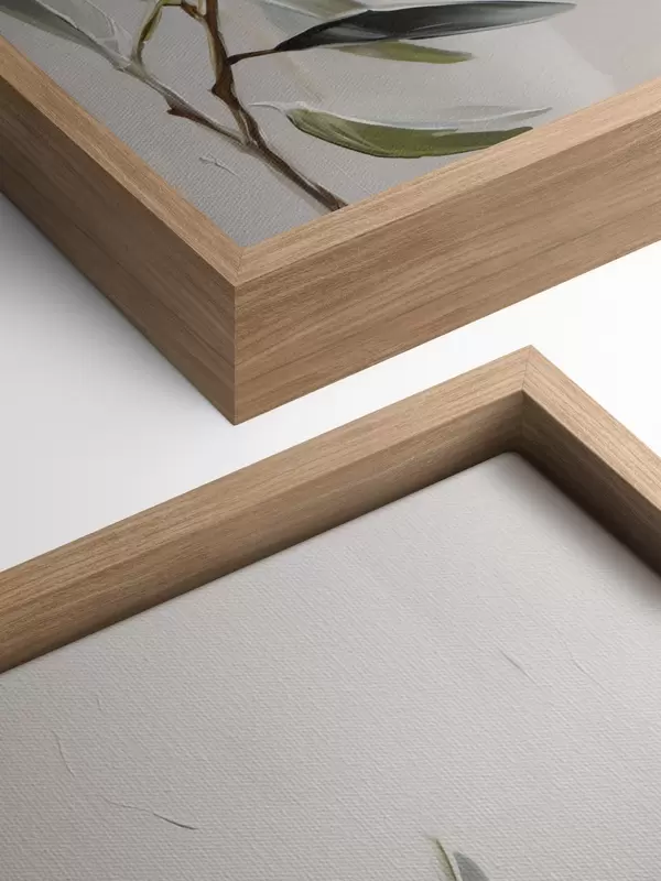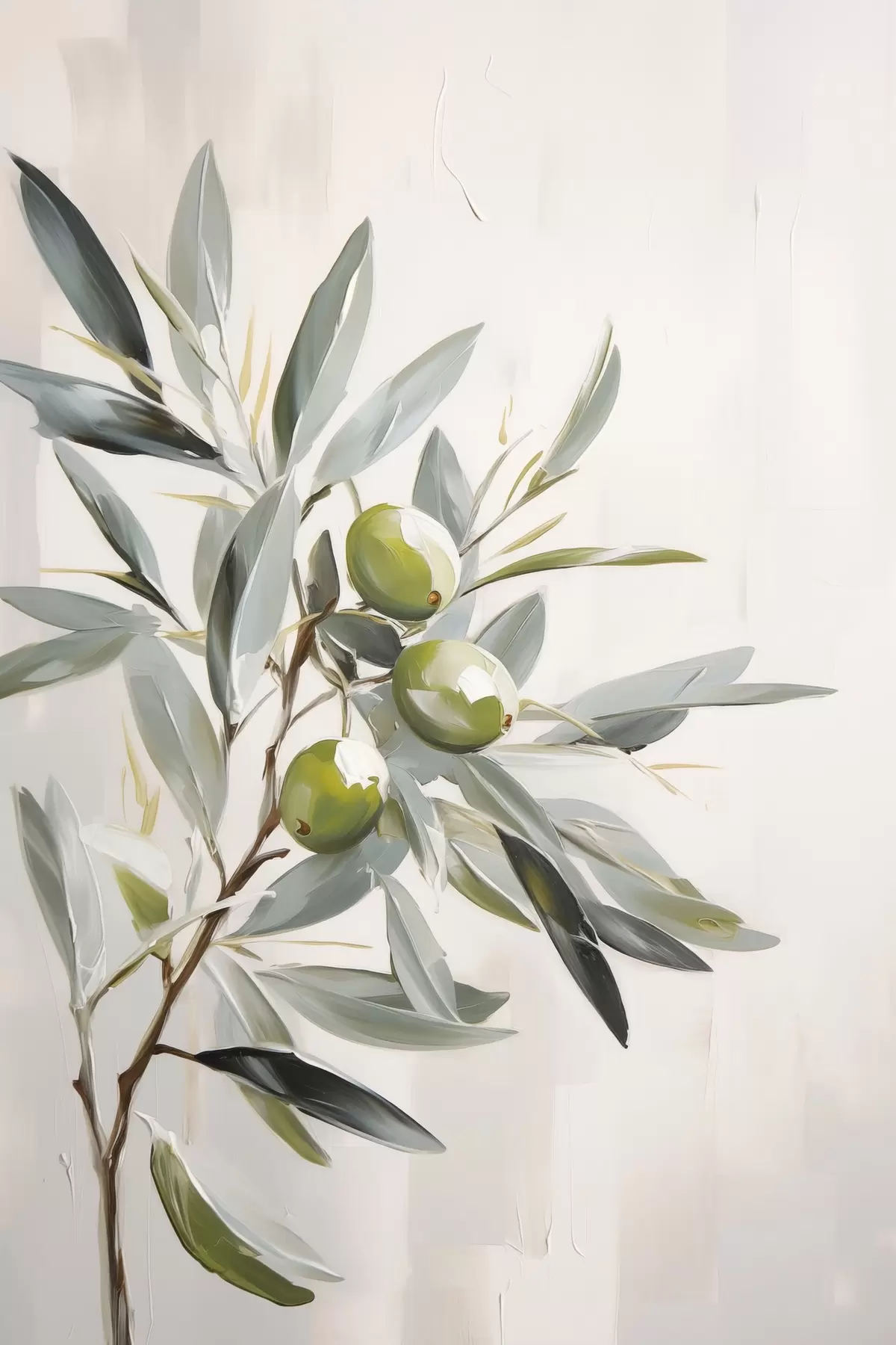 Paveikslas alyvmedžio šakelė, žali vaisiai, prislopinti tonai, lapai, minimalus, natūralus, aliejinė tapyba, botaninis Nr s45109