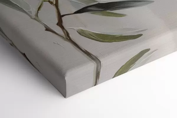 Paveikslas alyvmedžio šakelė, žali vaisiai, prislopinti tonai, lapai, minimalus, natūralus, aliejinė tapyba, botaninis Nr s45109