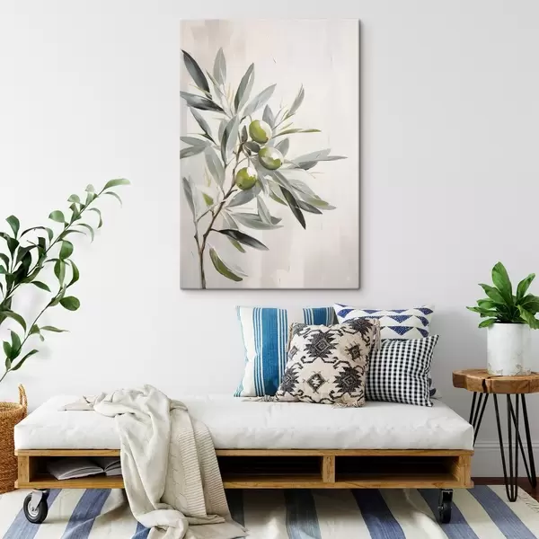 Paveikslas alyvmedžio šakelė, žali vaisiai, prislopinti tonai, lapai, minimalus, natūralus, aliejinė tapyba, botaninis Nr s45109