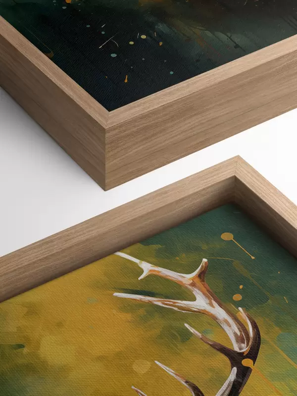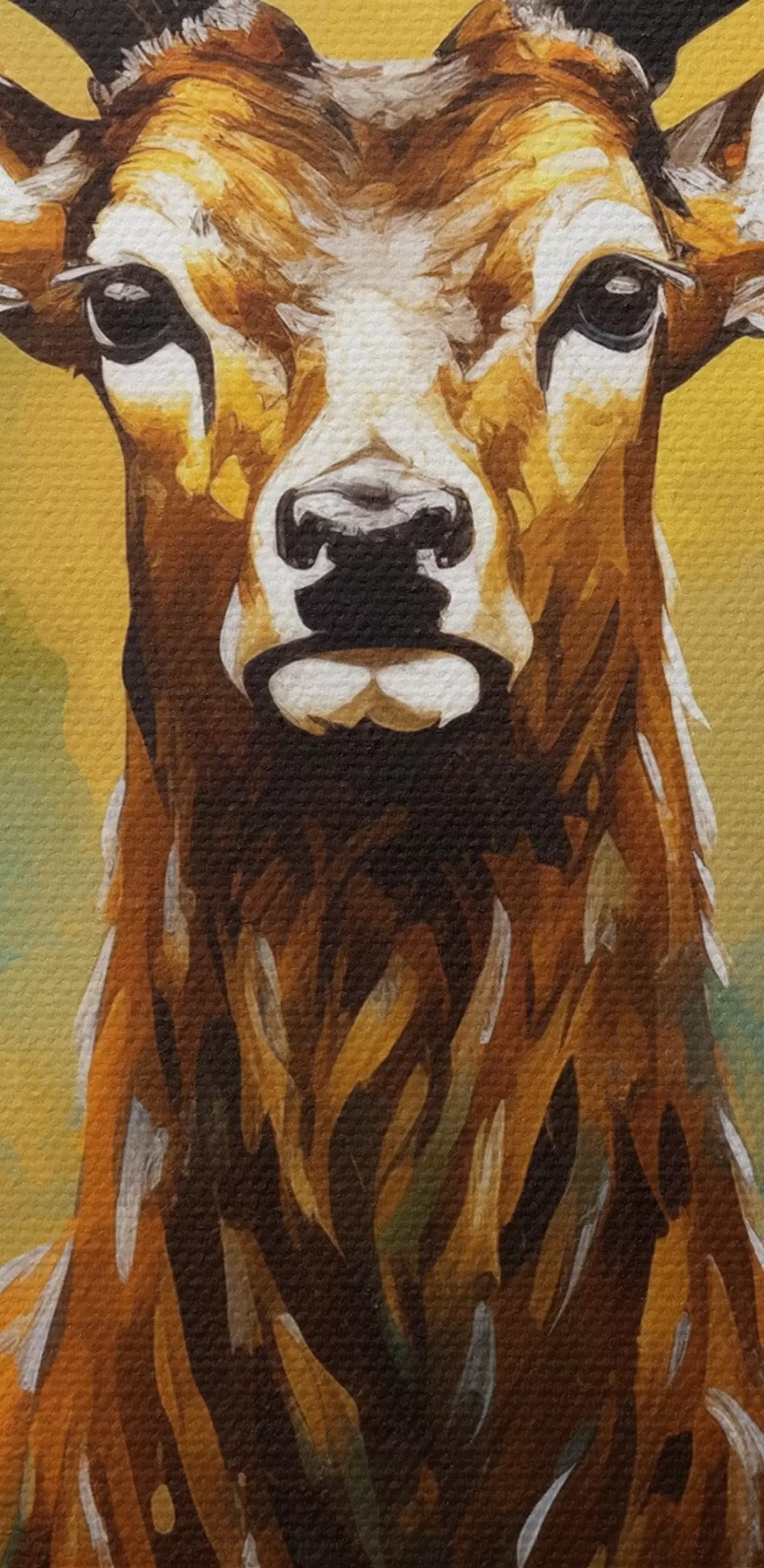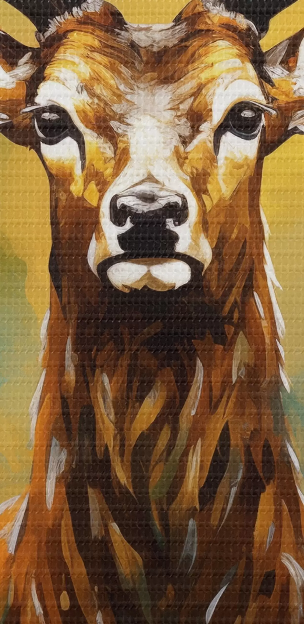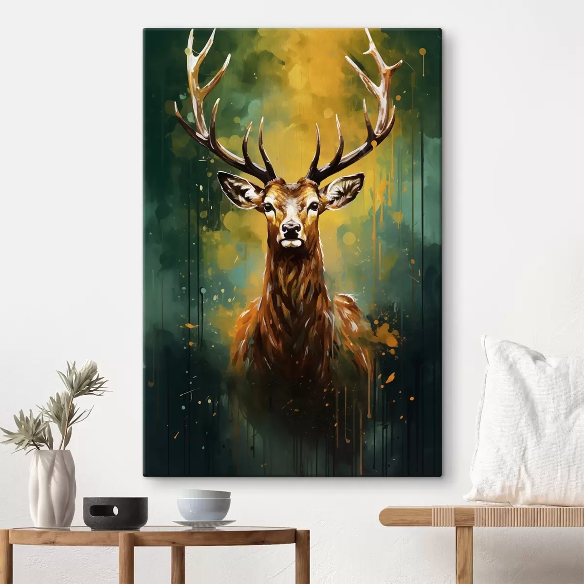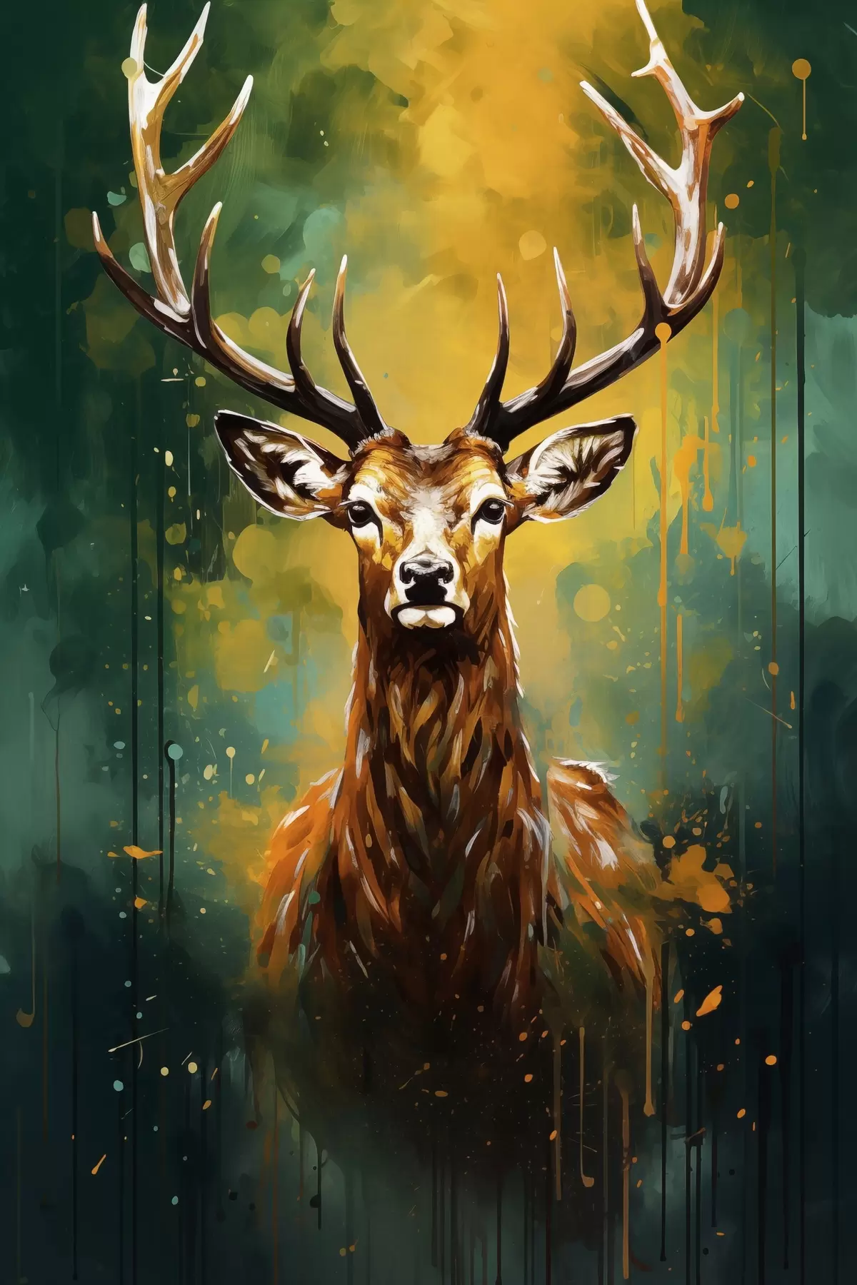 Paveikslas elnias, ragai, miško žalia, oranžinė purslų, gyvūnų portretas, dažų lašėjimas, drąsus, laukinė gamta Nr s45111