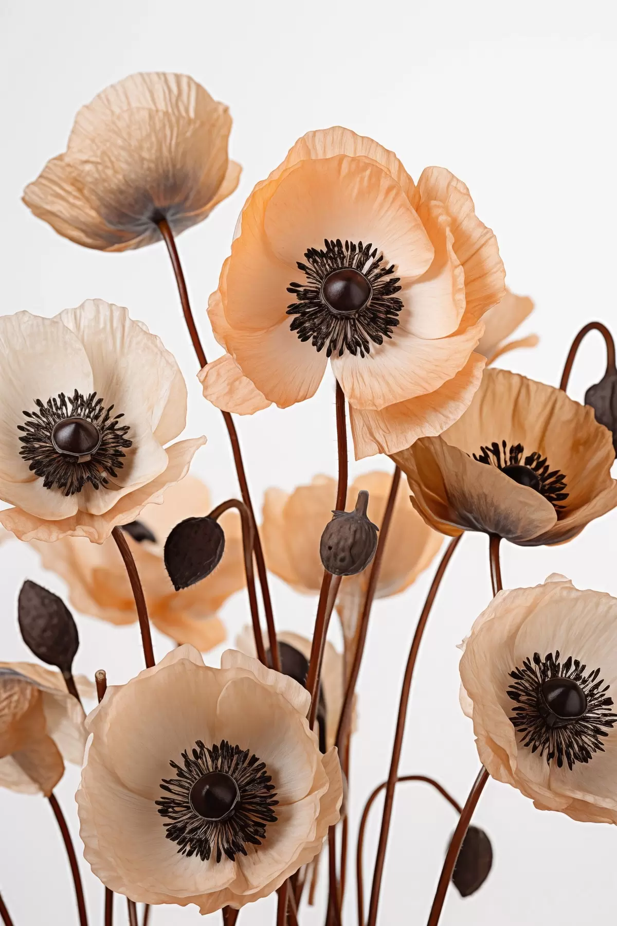 Paveikslas Oranžinės aguonos, džiovintos gėlės šviesiame fone, švelnus apšvietimas, subtilūs žiedlapiai, gėlių kompozicija Nr s45168