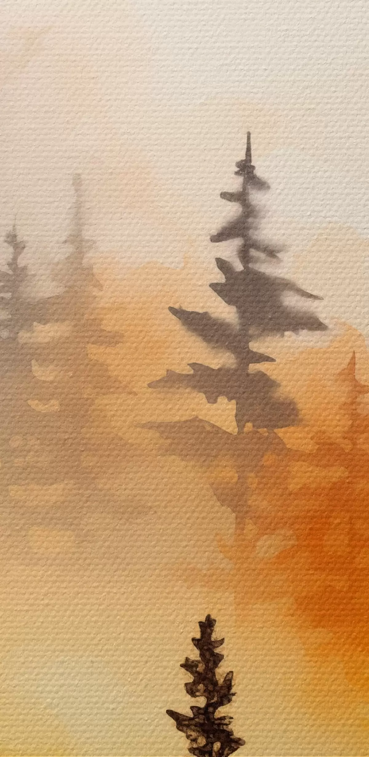 Paveikslas Peizažo akvarele tapyba, imituojanti mišką su aukštomis pušimis ir kalnais fone Nr s45170