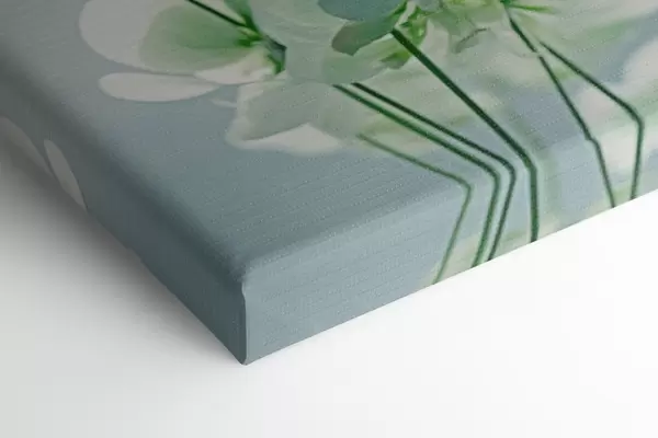 Paveikslas Baltų dobilų gėlės su žaliu stiebu ir lapais, minkštas apšvietimas, švarus fonas, minimalistinė kompozicija, botaninis Nr s45172