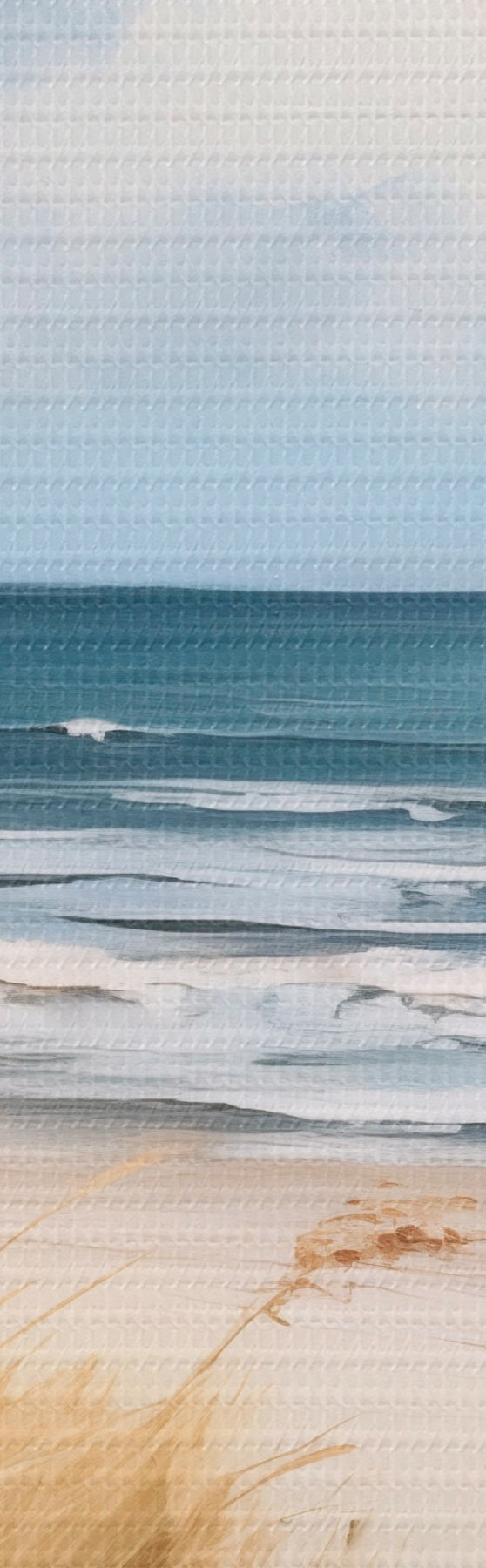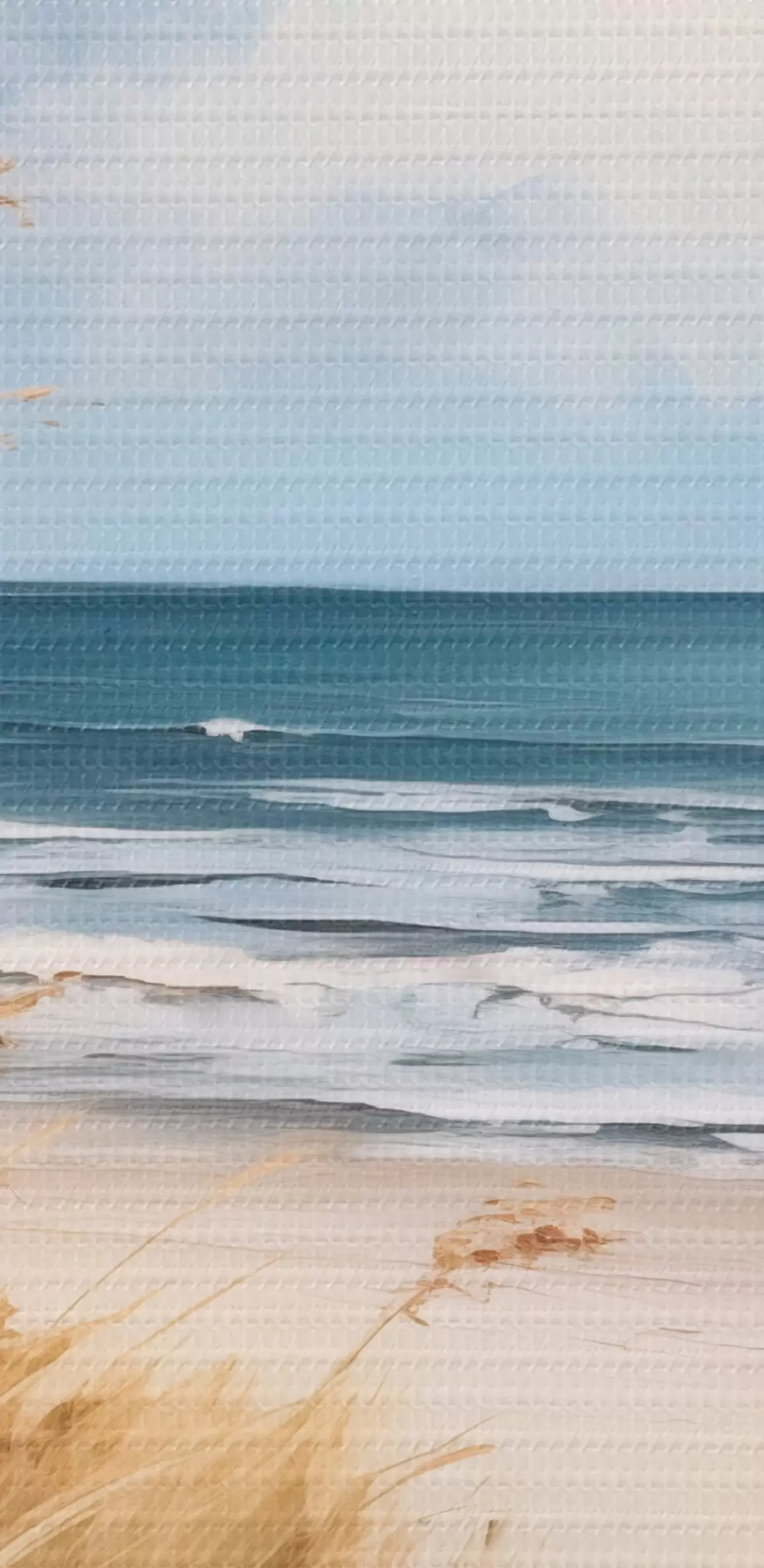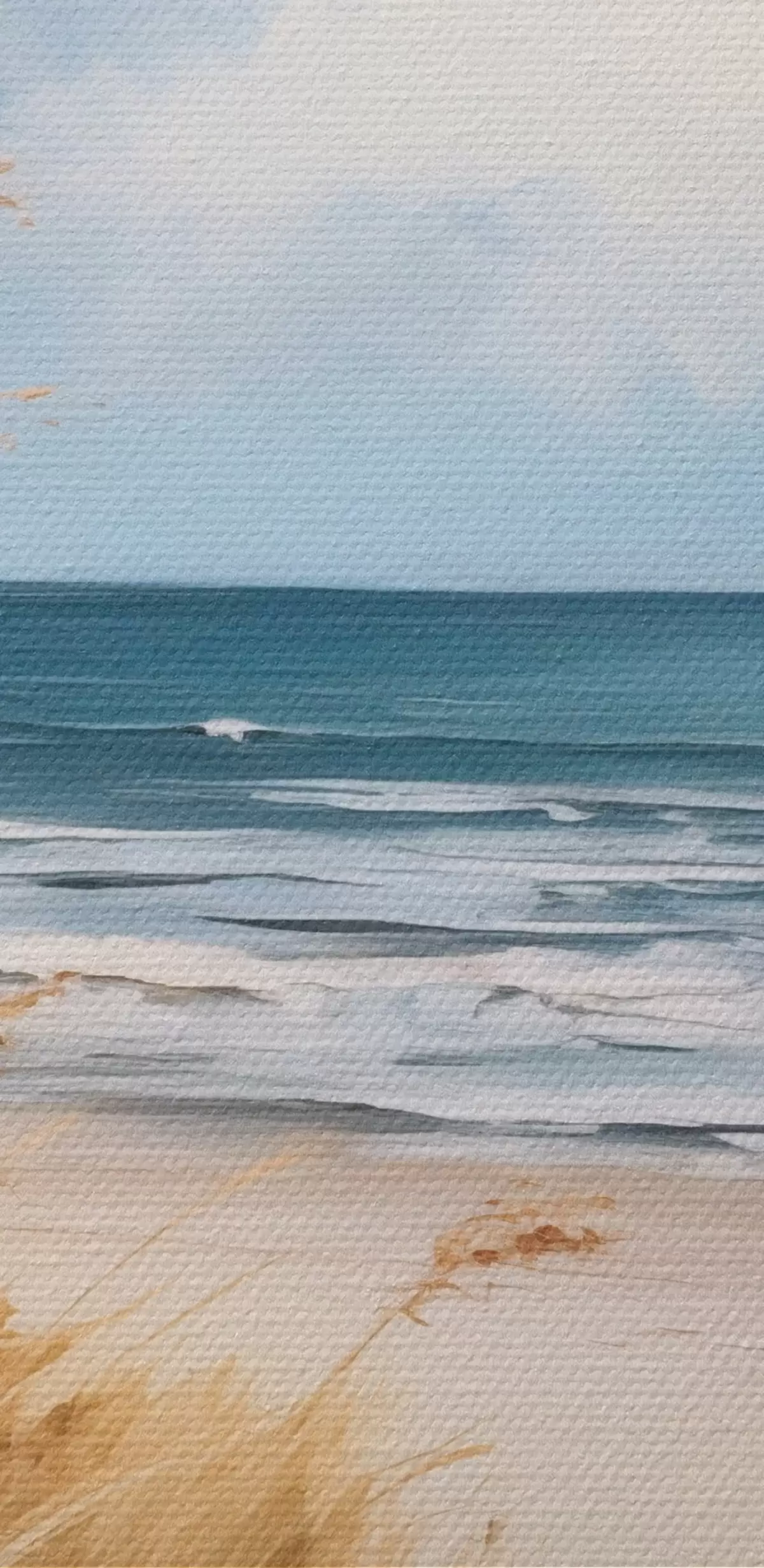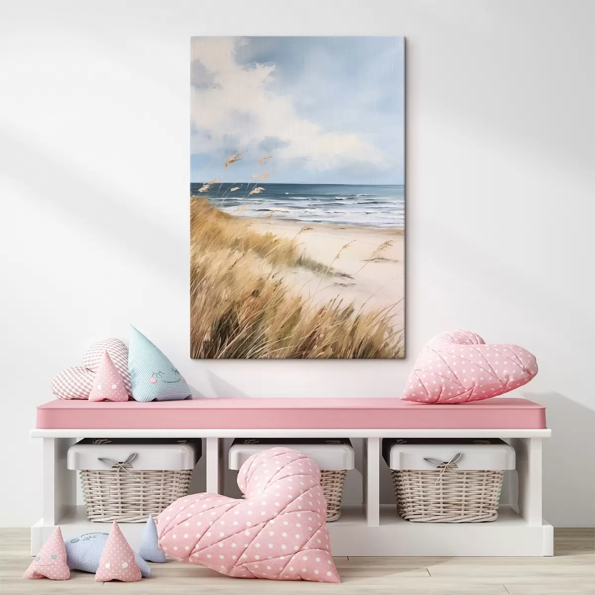 Paveikslas Smėlėtas paplūdimys su aukšta žole pirmame plane, vandenynas su bangomis ir debesuotas dangus antrame plane Nr s45174