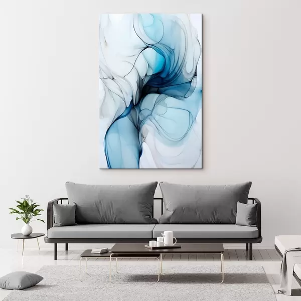 Paveikslas Abstrakti kompozicija su tekančiomis linijomis ir permatomais žiedlapiais mėlynos, baltos ir smėlio spalvos atspalviais, alkoholinio tušo imitacija Nr s45178