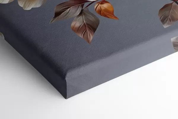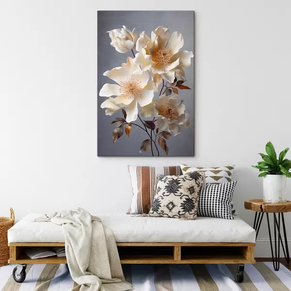 Paveikslas Tekstūruotos gėlės su oranžiniais piesteliais ir oranžiniais lapais pilkame fone, minkšta šviesa, elegantiškas, detalus, realistiškas Nr s45181