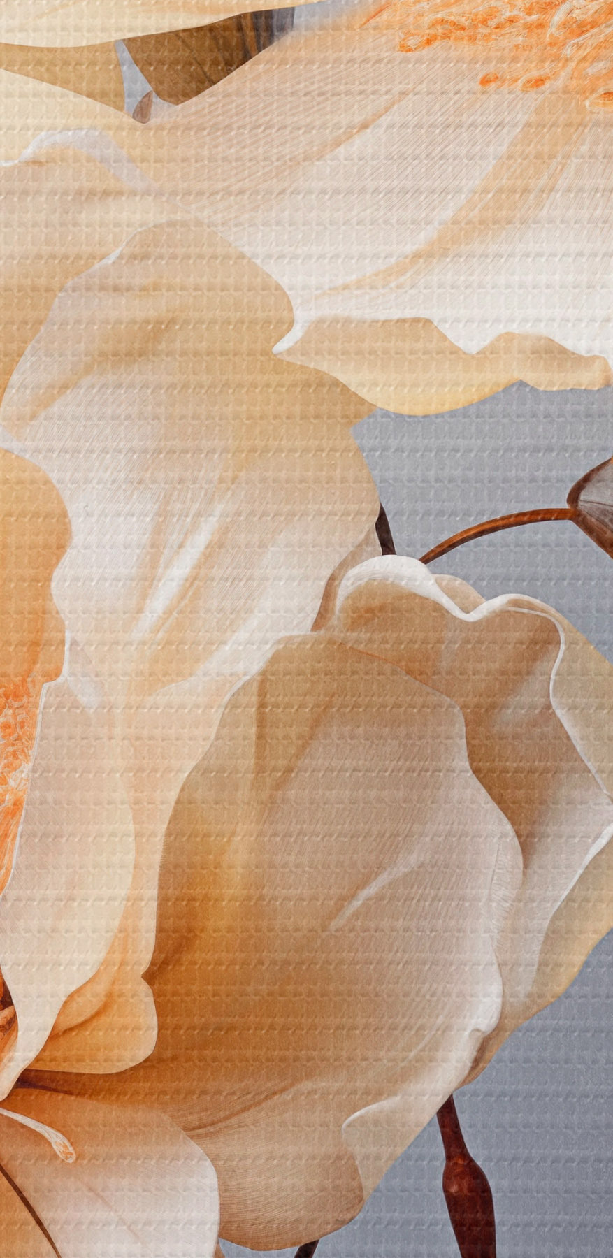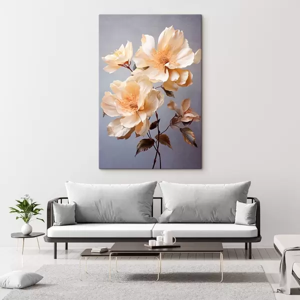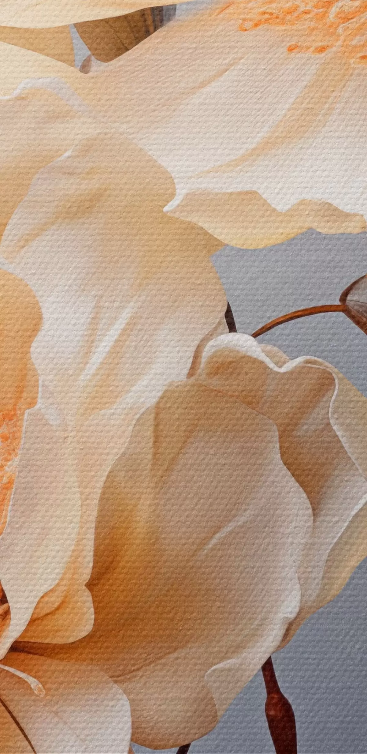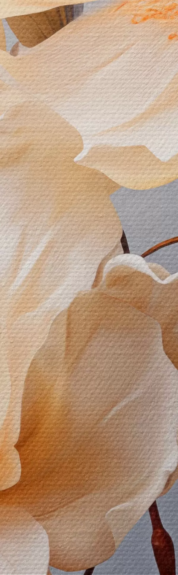 Paveikslas Tekstūruotos gėlės su oranžiniais piesteliais ir oranžiniais lapais pilkame fone, minkšta šviesa, elegantiškas, detalus, realistiškas Nr s45182