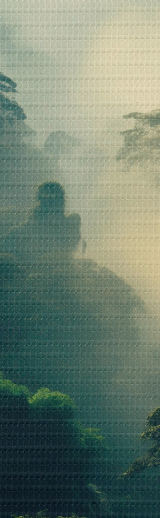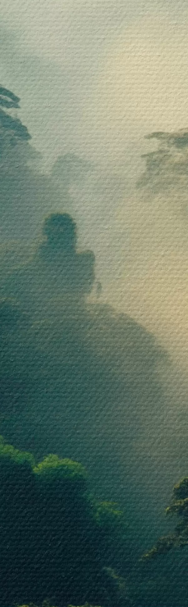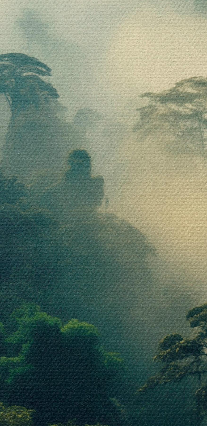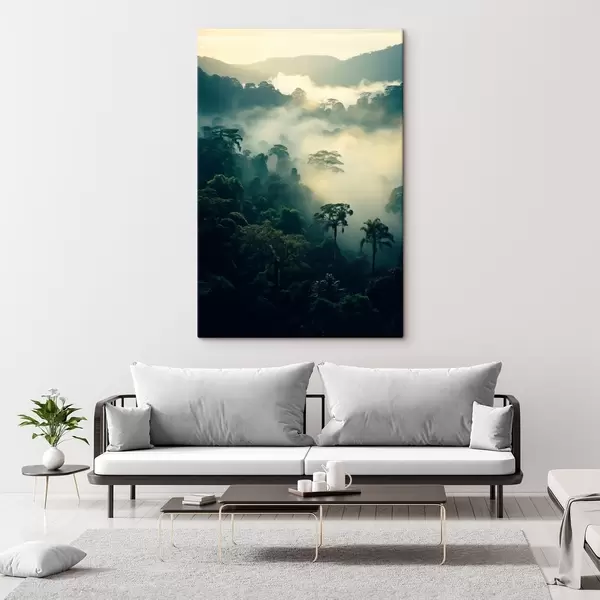 Paveikslas Atogrąžų atogrąžų miškas su vešliais žaliais medžiais ir storu rūko sluoksniu, sukuriančiu atmosferinę aplinką Nr s45190