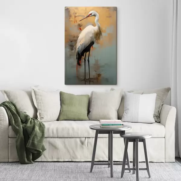 Paveikslas Baltasis garnys prislopintų geltonų, rudų ir mėlynų atspalvių fone, primenančiame miglotą abstraktų peizažą Nr s45191