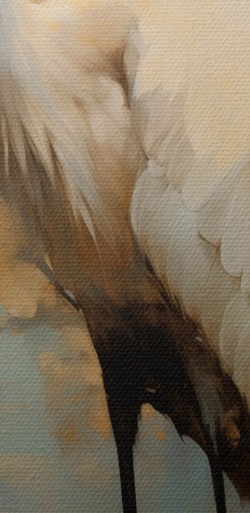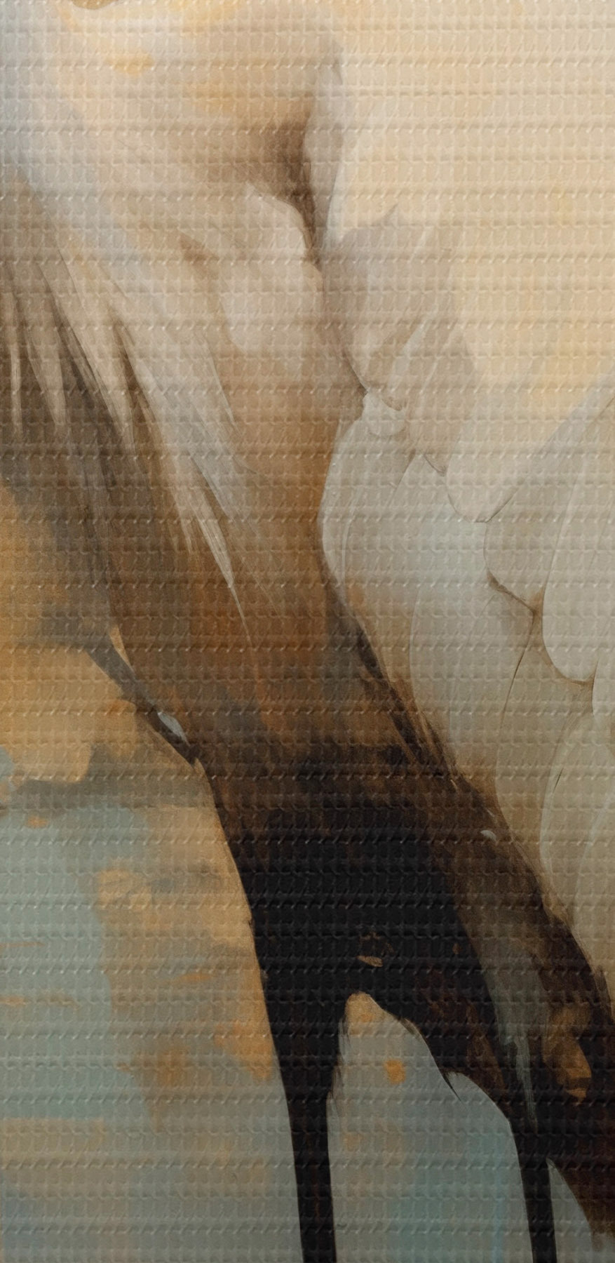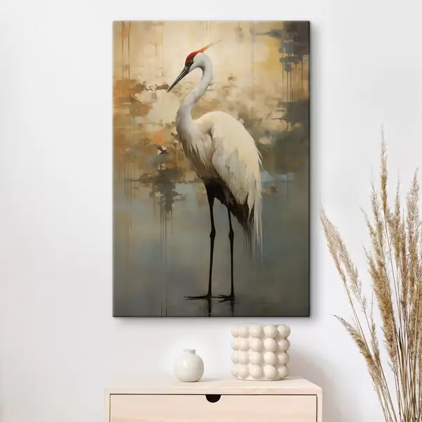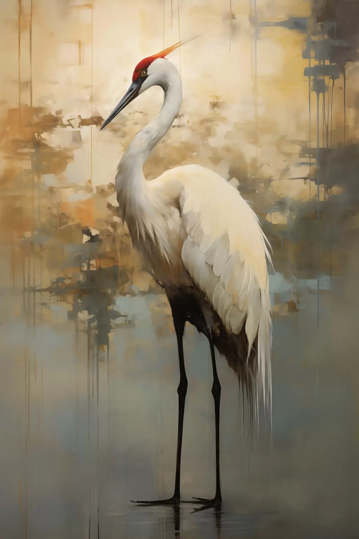 Paveikslas Baltasis garnys prislopintų geltonų, rudų ir mėlynų atspalvių fone, primenančiame miglotą abstraktų peizažą Nr s45192