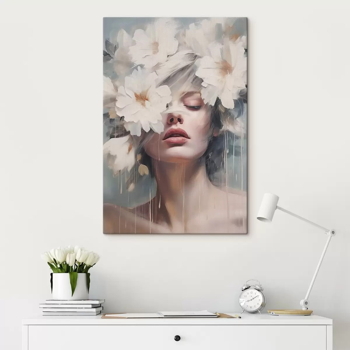 Paveikslas Moters portretas su baltomis gėlėmis Nr s45219