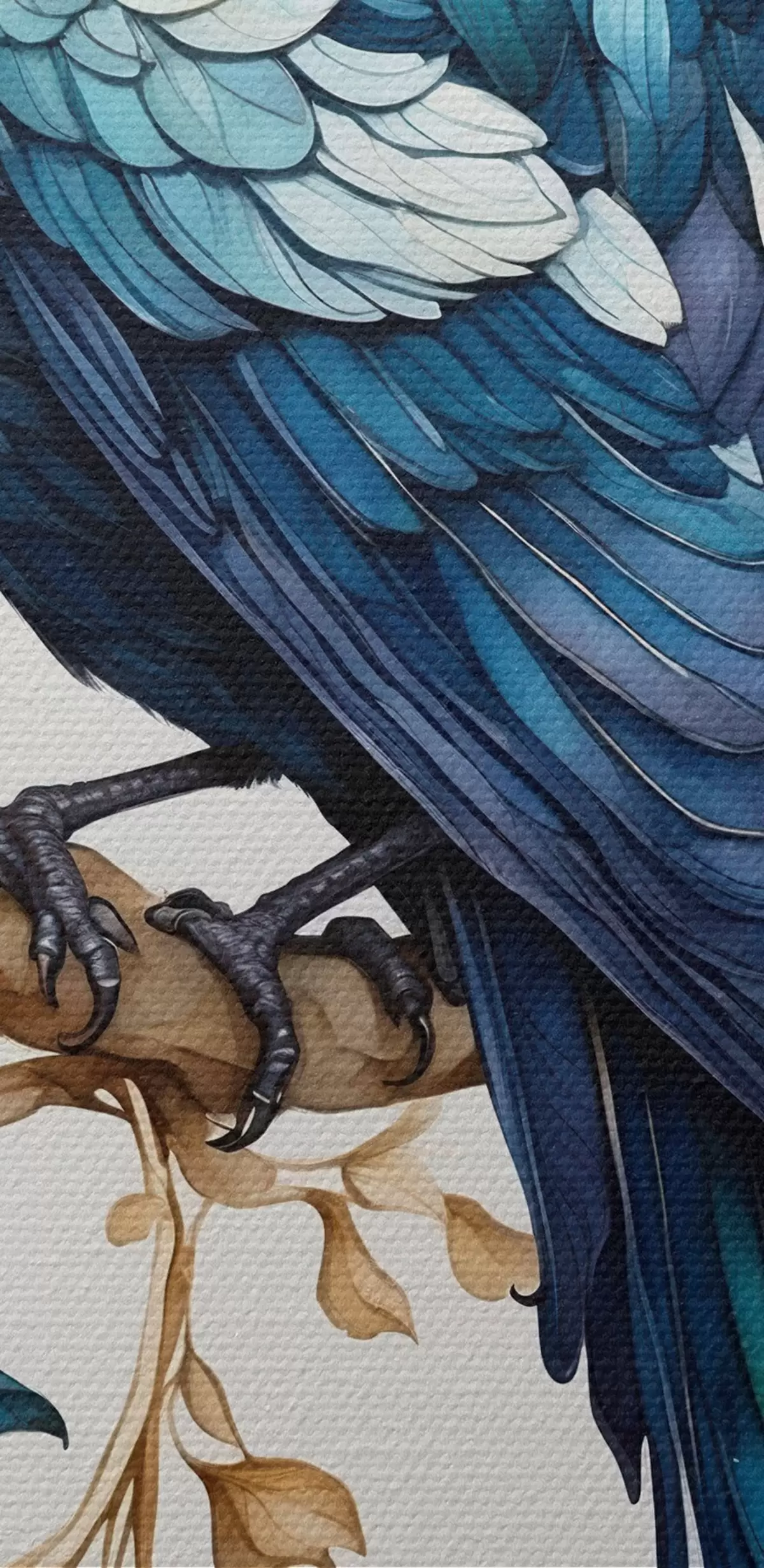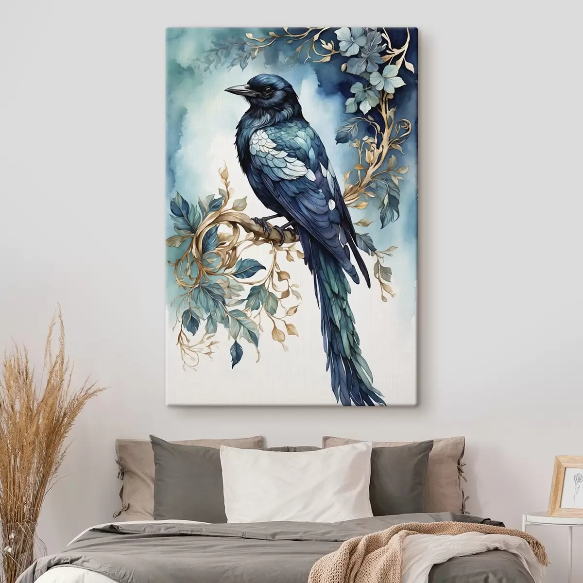 Paveikslas Mėlynas paukštis ant šakos su akvarelės stiliaus lapais Nr s45483