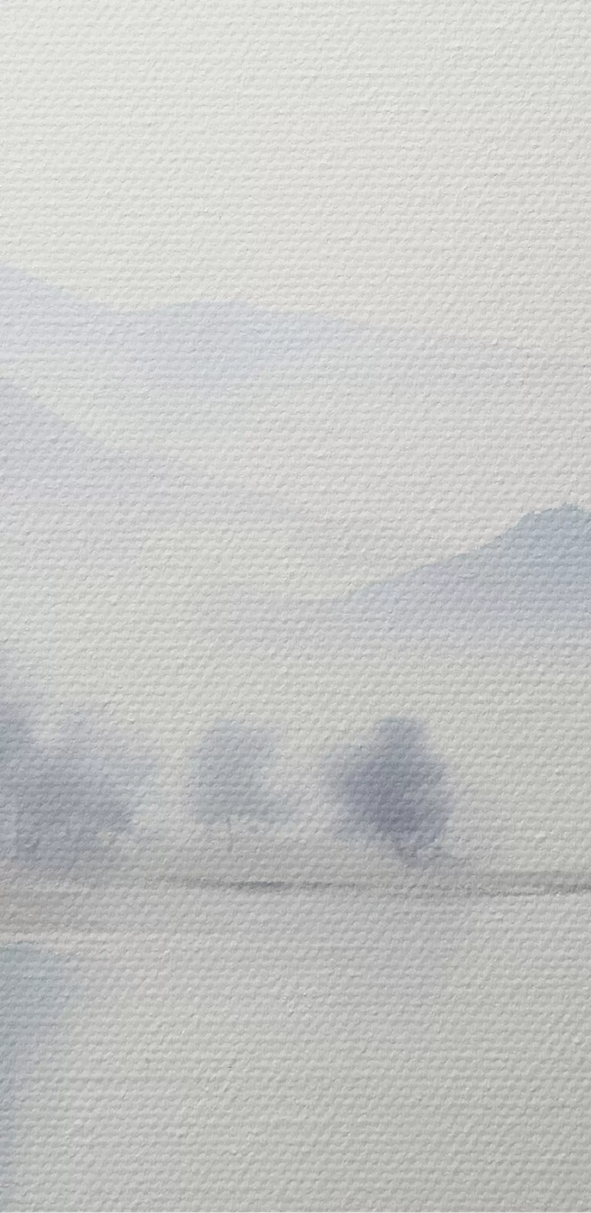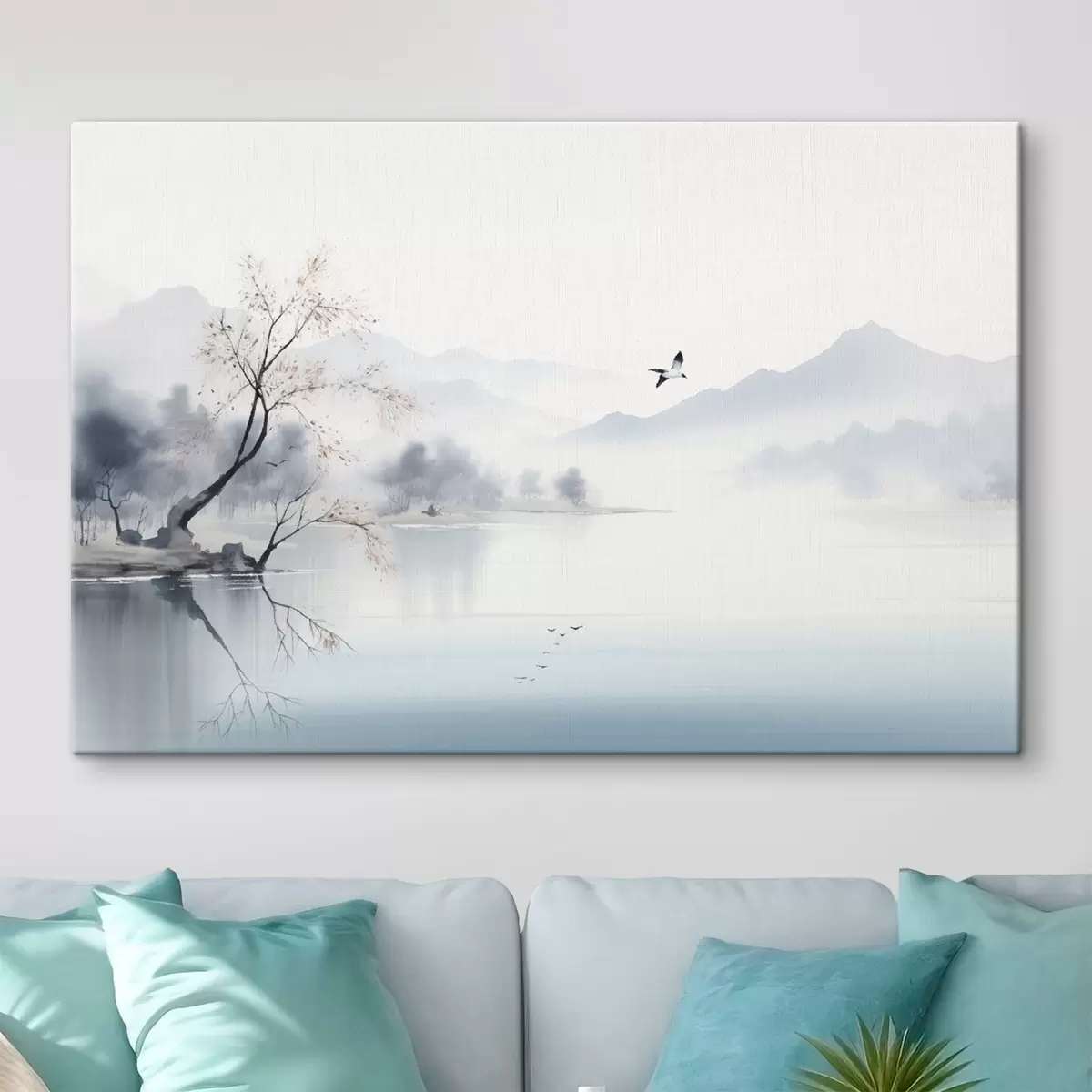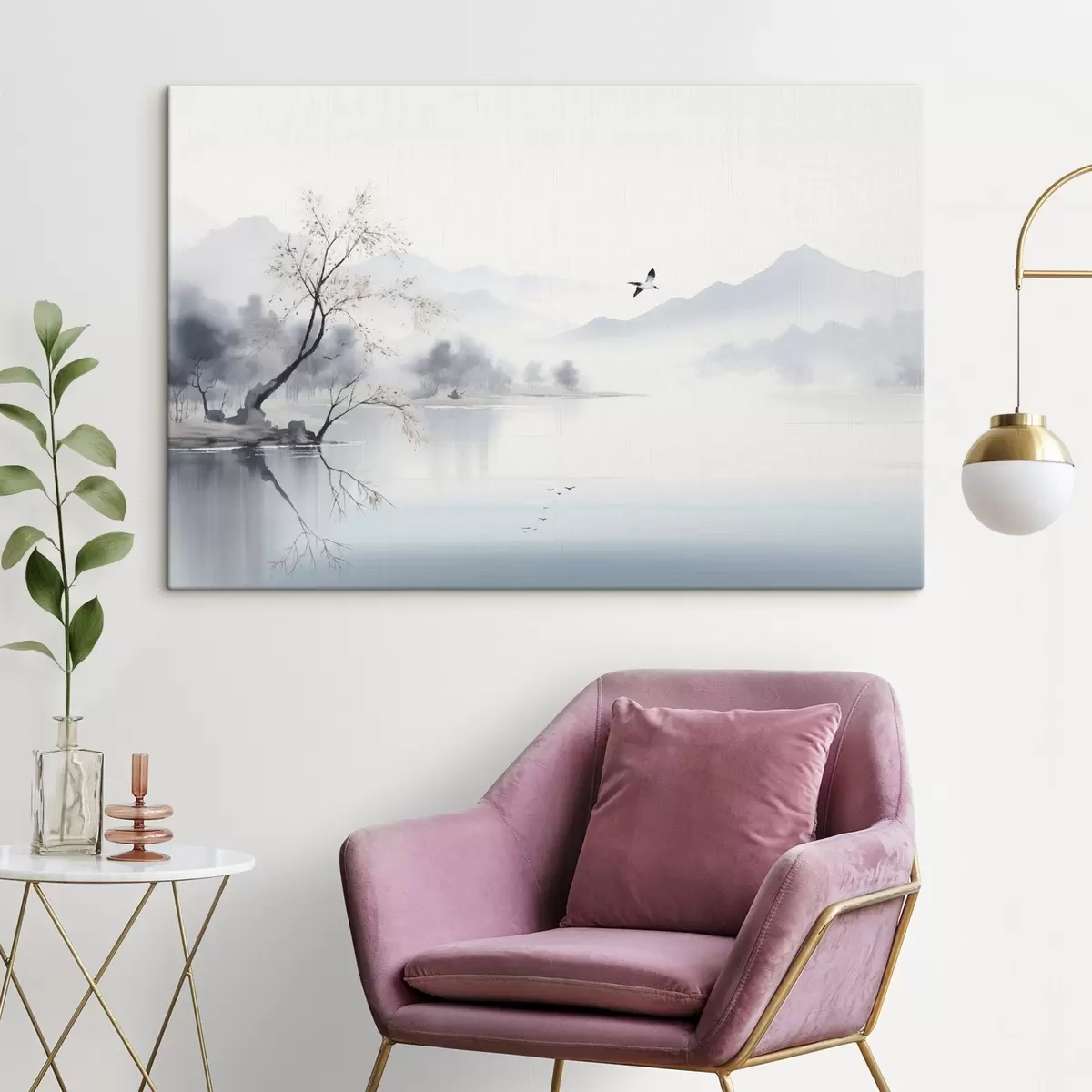 Paveikslas Miglotas kraštovaizdis su medžiu, kalnais ir paukščiais Nr s45518