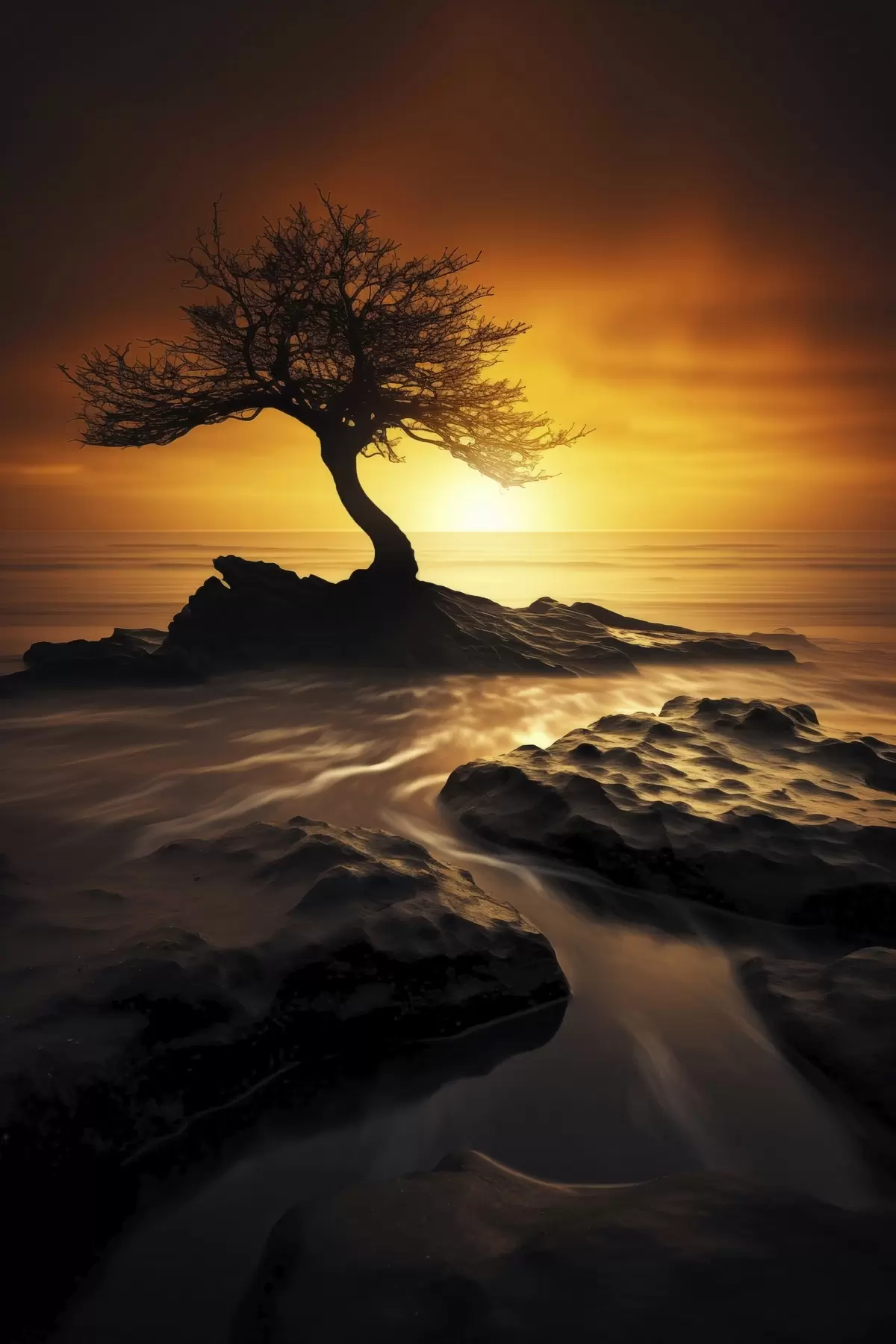 Paveikslas Vienišas medis ant uolos saulėlydžio metu Nr s45524