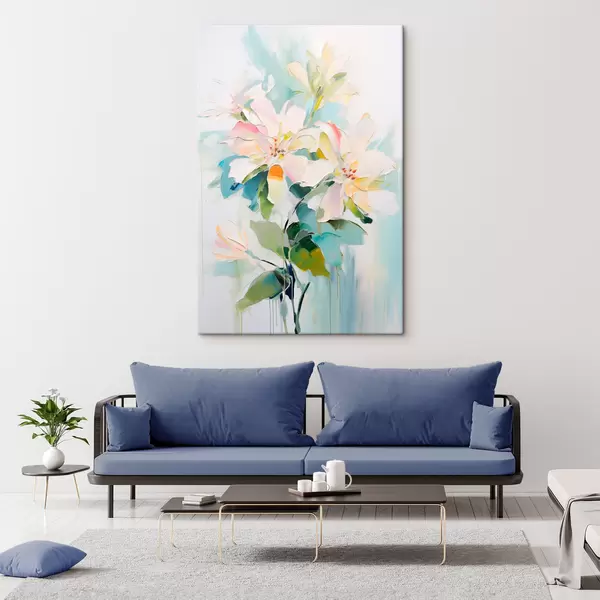 Paveikslas Gėlės su spalvotais akcentais, žali lapai, minkšti potėpiai aliejinės tapybos imitacija, šviesiai mėlynas fonas Nr s45549