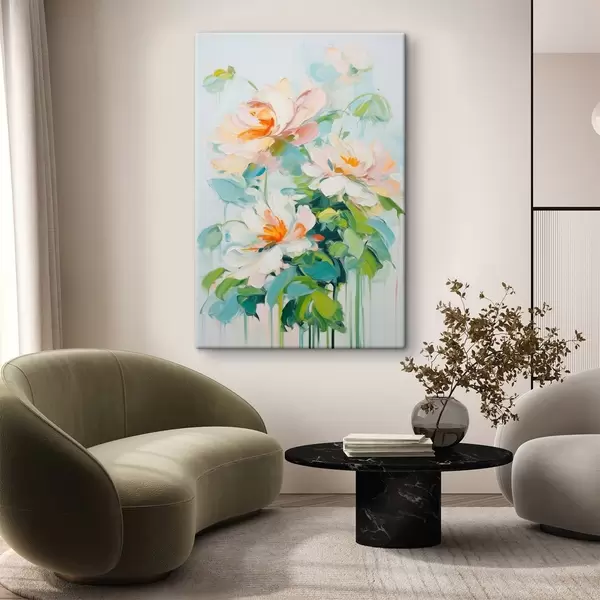 Paveikslas Baltos ir pastelinės persikų gėlės, žali lapai, minkšti potėpiai teptuku, aliejinės tapybos imitacija, šviesiai mėlynas fonas Nr s45550