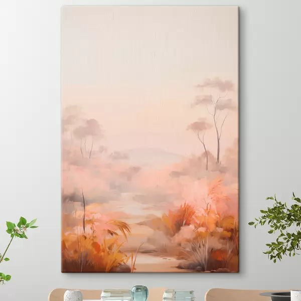 Paveikslas Kraštovaizdis su rausvų, oranžinių ir rudų atspalvių krūmais ir medžiais, fone - kalnai Nr s45553