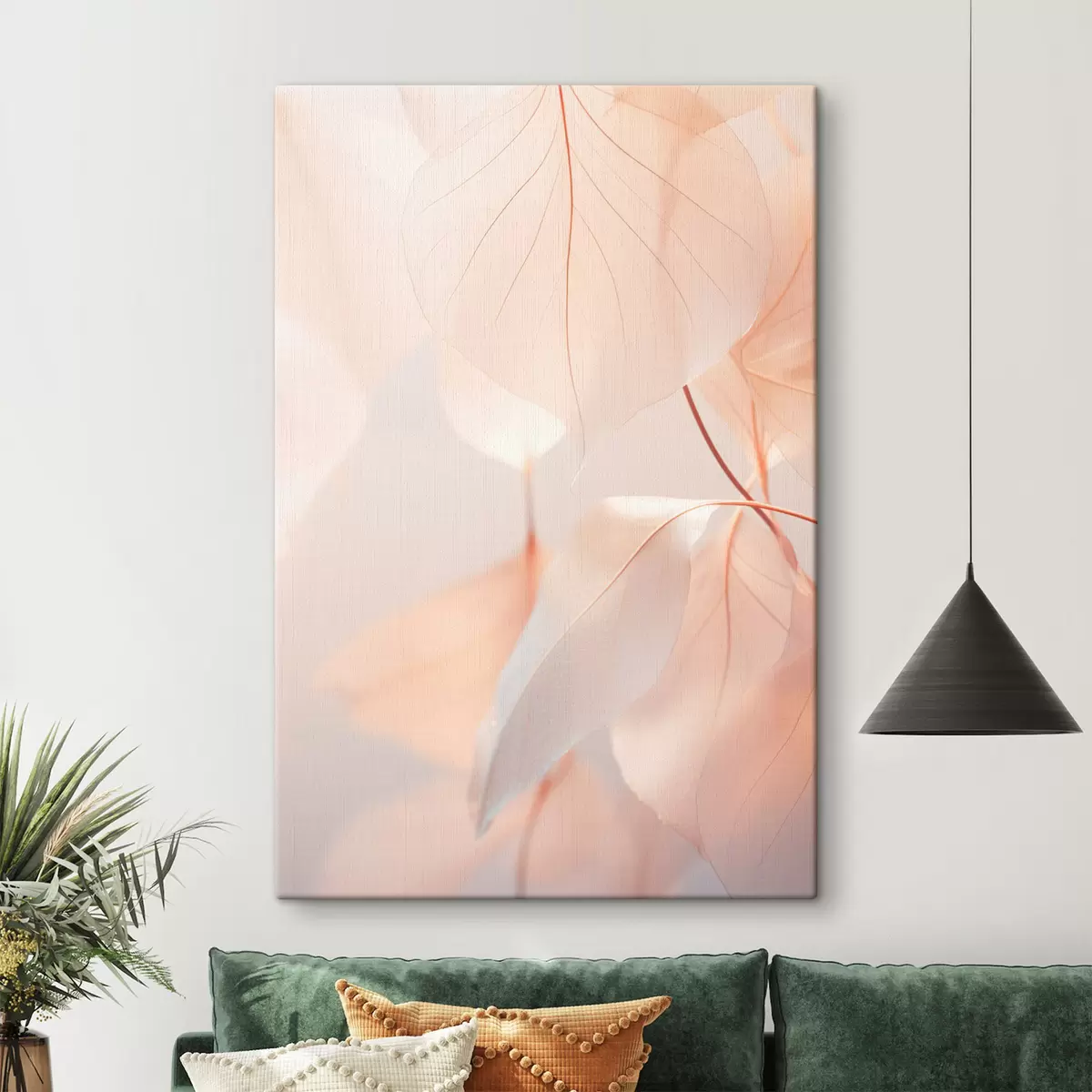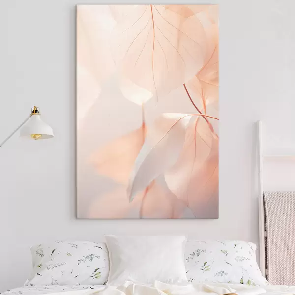 Paveikslas Permatomų lapų su švelniomis gyslomis stambiu planu, švelni persikų ir balta spalvų paletė, neryškus fonas Nr s45556