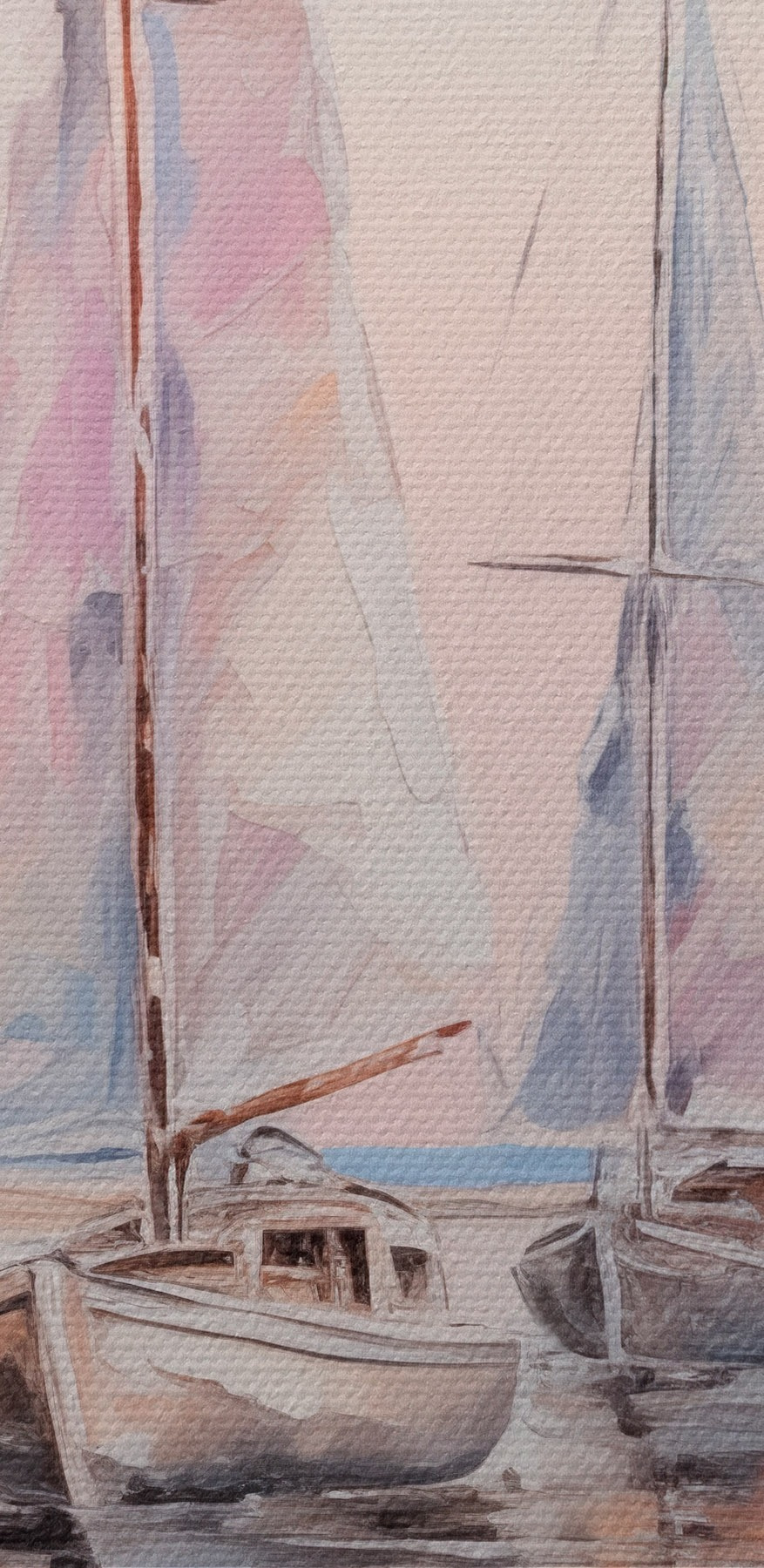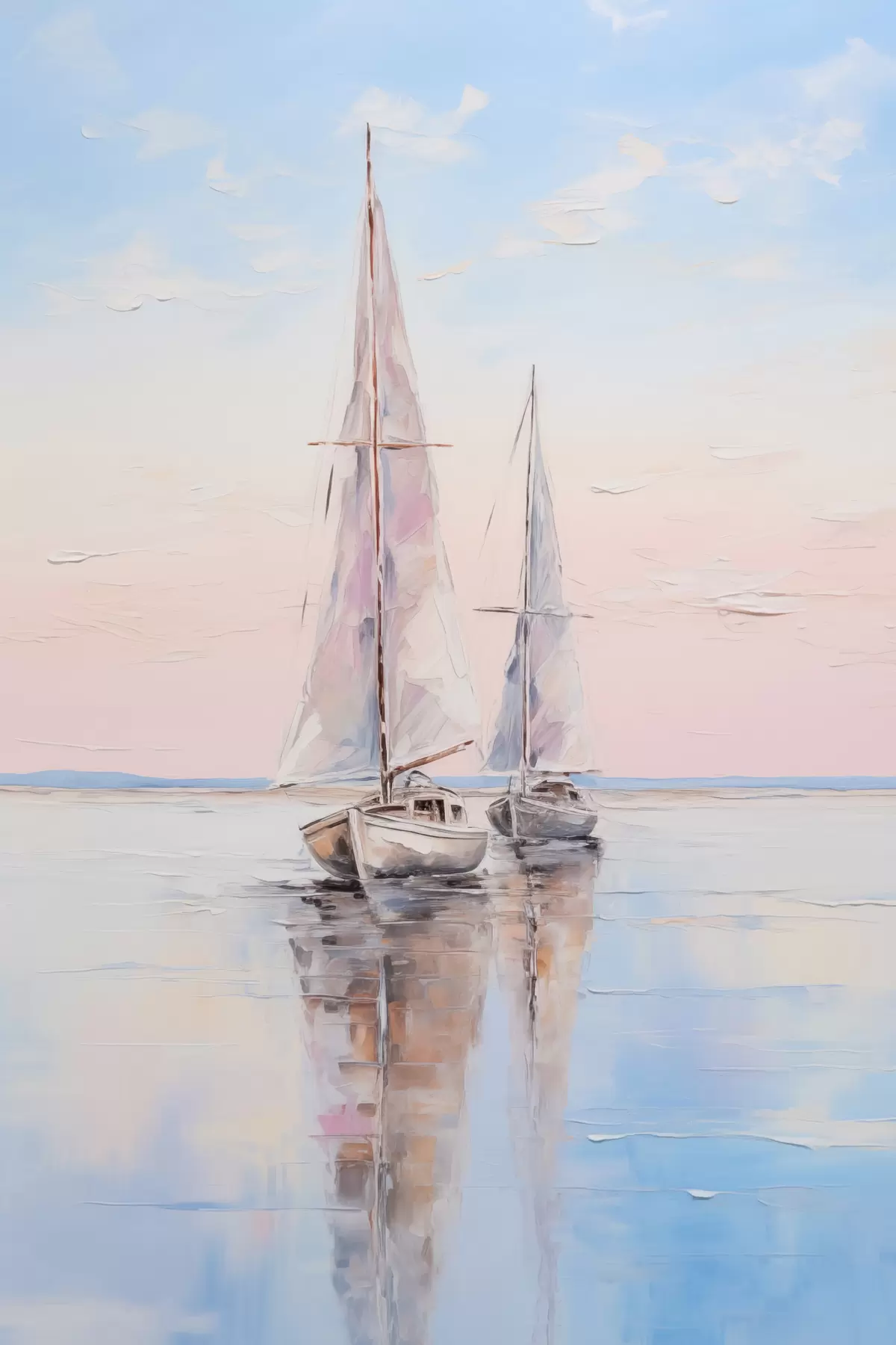 Paveikslas Ramioje jūroje plaukiojančios burinės valtys su rausvomis burėmis, valčių atspindžiai vandenyje, švelnios pastelinės spalvos Nr s45558