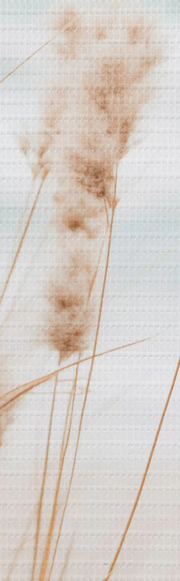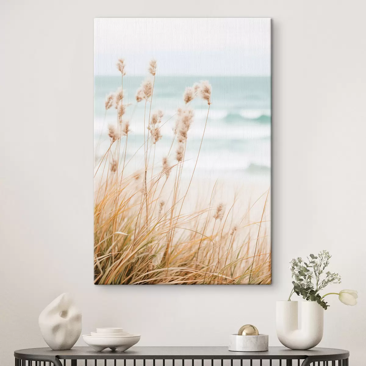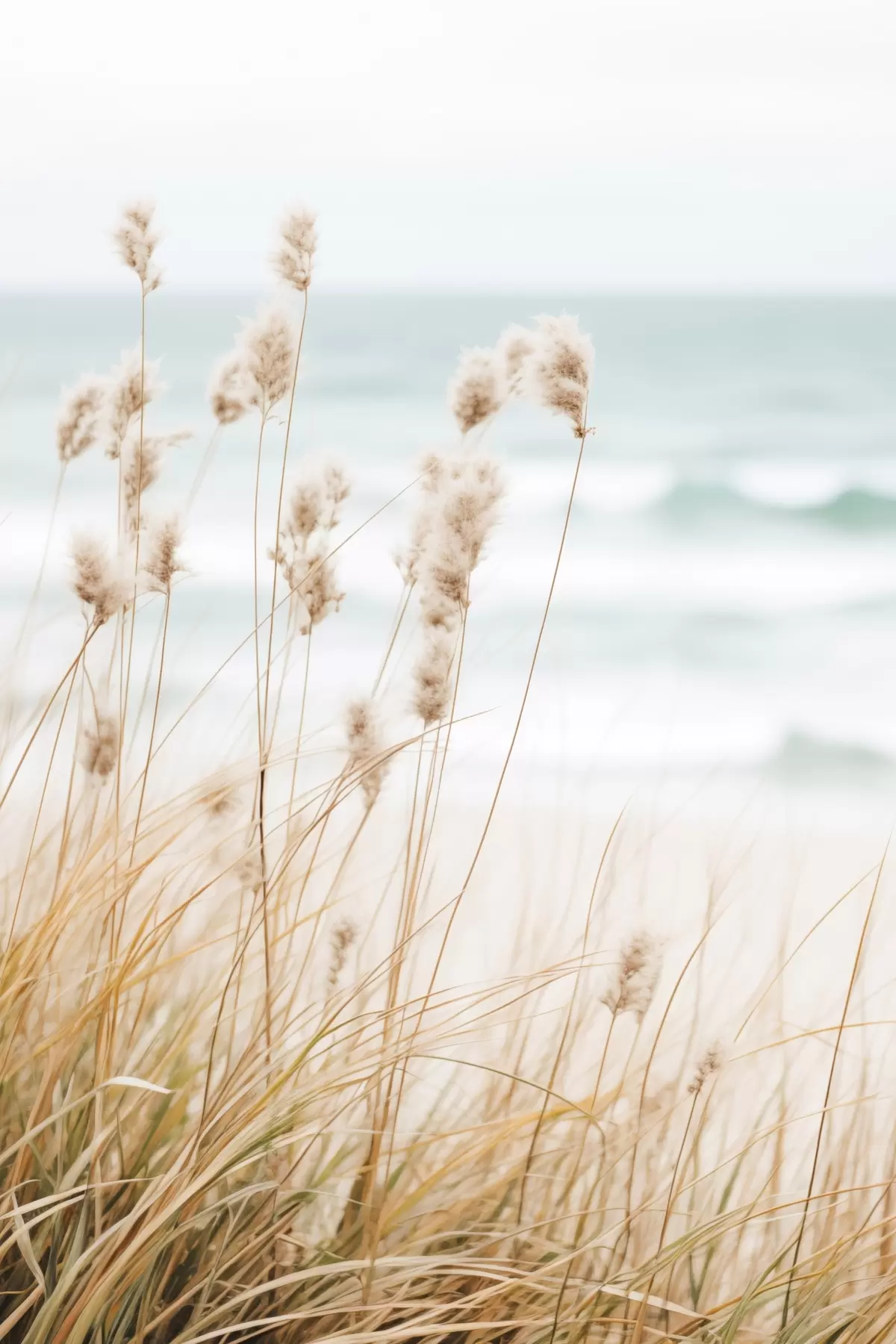 Paveikslas Aukšta žolė su pūkuotomis sėklų galvutėmis, smėlio paplūdimys ir vandenyno bangos fone, švelni ir prislopinta spalvų paletė Nr s45561
