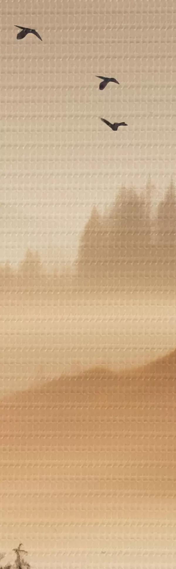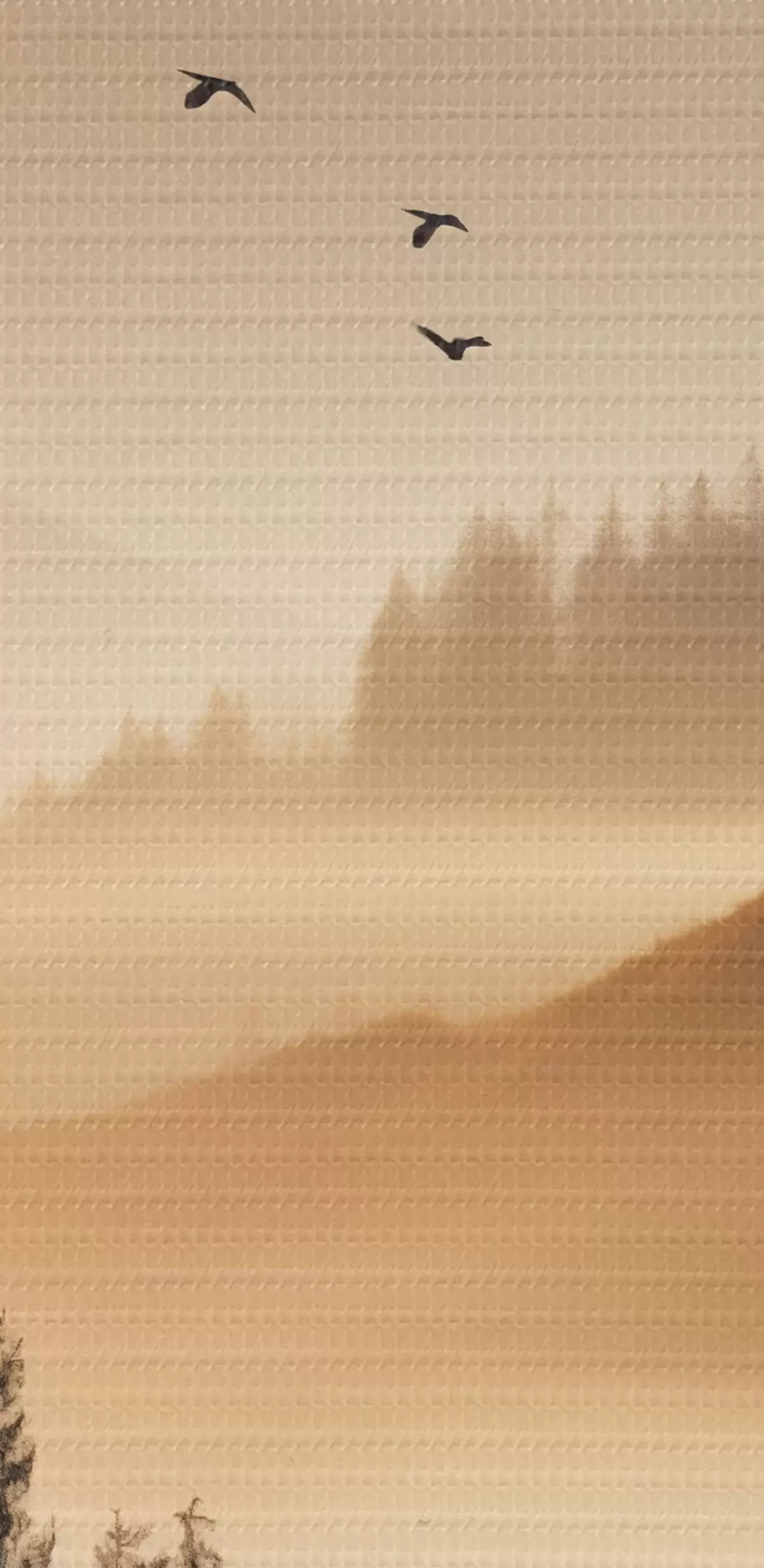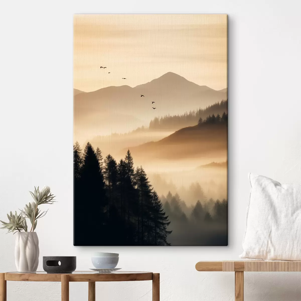 Paveikslas Kalnų kraštovaizdis su mišku ir danguje skrendančiais paukščiais, visa tai dengia storas rūko sluoksnis saulėtekio metu Nr s45563