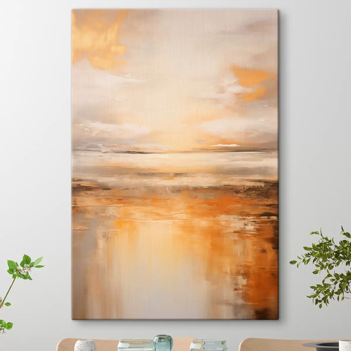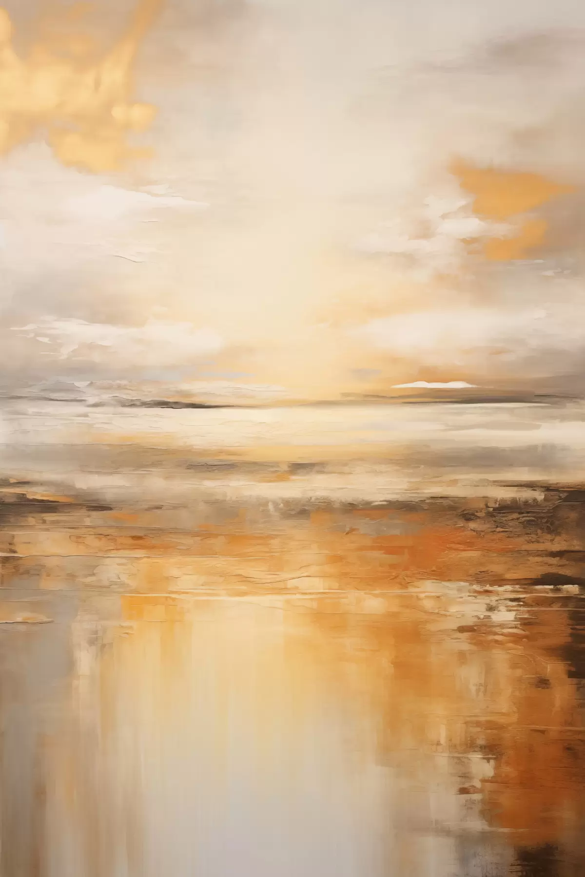 Paveikslas Abstraktus paplūdimio peizažas su ramiu vandenynu, oranžiniu smėliu ir debesuotu dangumi su saule Nr s45567