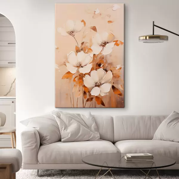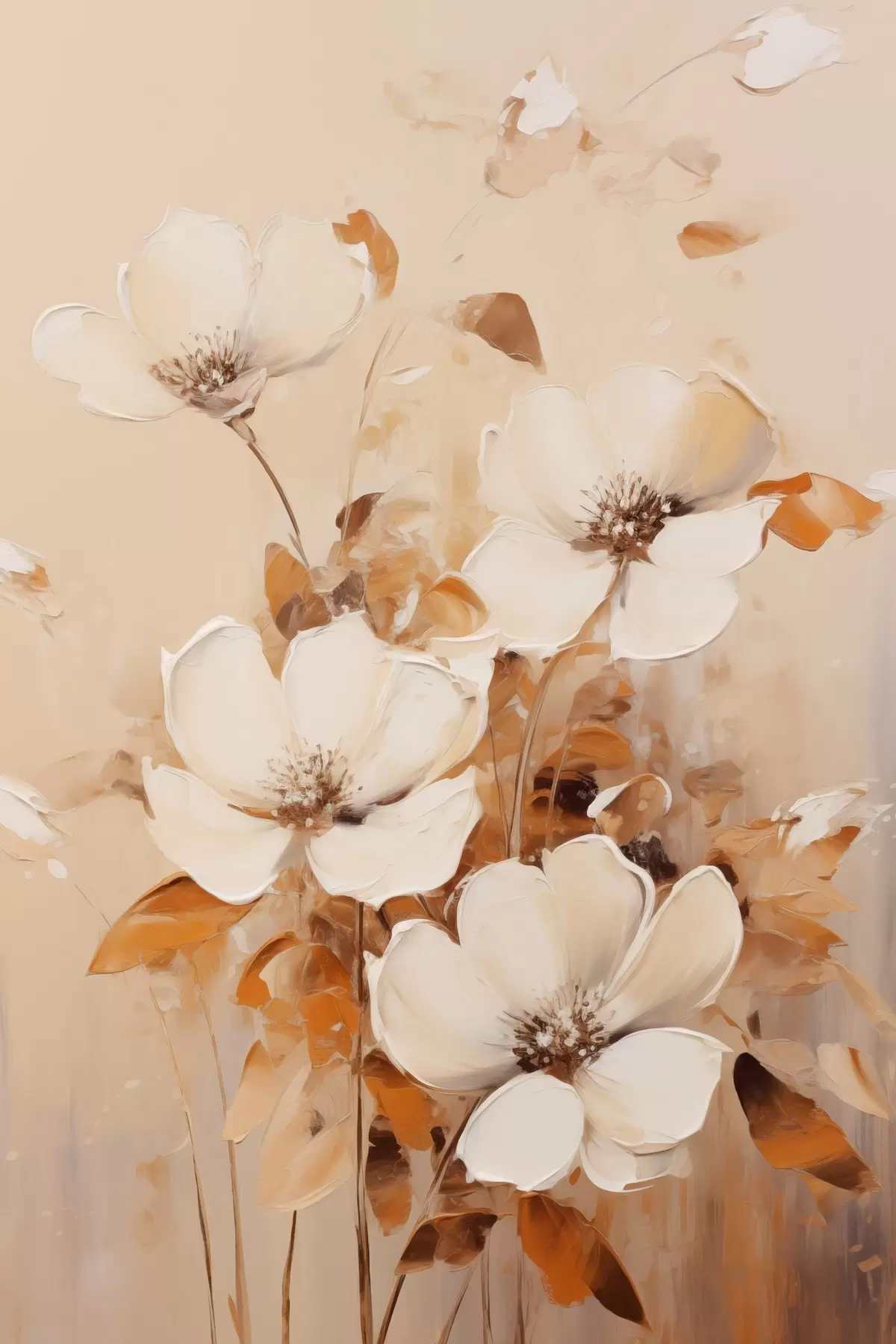 Paveikslas Baltos gėlės su oranžiniais lapais, subtilūs potėpiai, šilta spalvų paletė, elegantiška kompozicija Nr s45573